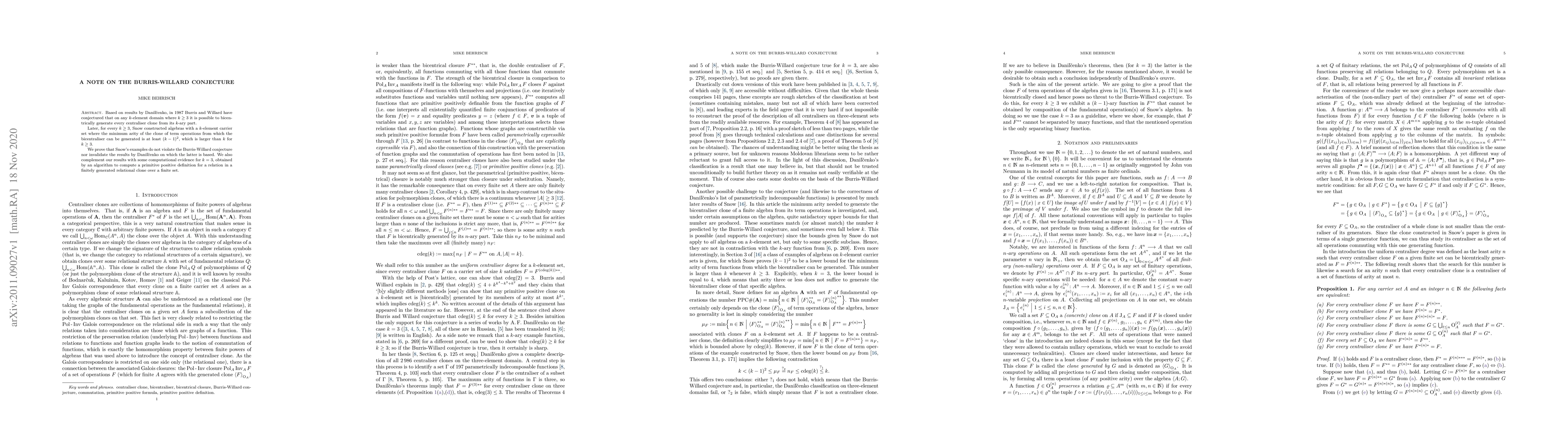 Based on results by Dani\v{l}\v{c}enko, in 1987 Burris and Willard have conjectured that on any $k$-element domain where $k\geq 3$ it is possible to bicentrically generate every centraliser clone from its $k$-ary part. Later, for every $k\geq 3$, Snow constructed algebras with a $k$-element carrier set where the minimum arity of the clone of term operations from which the bicentraliser can be generated is at least $(k-1)^2$, which is larger than $k$ for $k\geq 3$. We prove that Snow's examples do not violate the Burris-Willard conjecture nor invalidate the results by Dani\v{l}\v{c}enko on which the latter is based. We also complement our results with some computational evidence for $k=3$, obtained by an algorithm to compute a primitive positive definition for a relation in a finitely generated relational clone over a finite set.