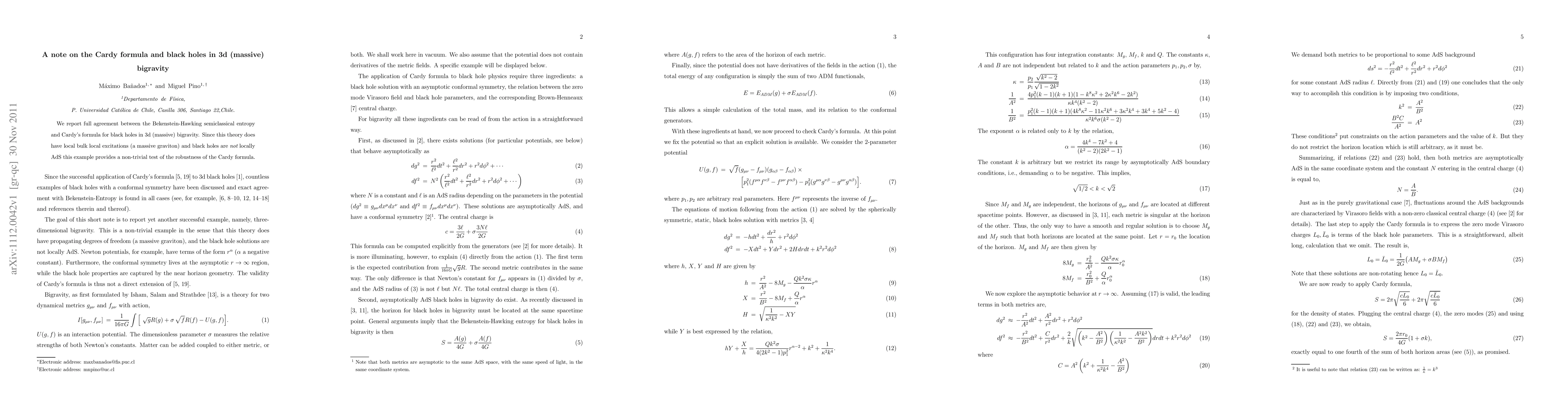 We report full agreement between the Bekenstein-Hawking semiclassical entropy and Cardy's formula for black holes in 3d (massive) bigravity. Since this theory does have local bulk local excitations (a massive graviton) and black holes are not locally AdS this example provides a non-trivial test of the robustness of the Cardy formula.