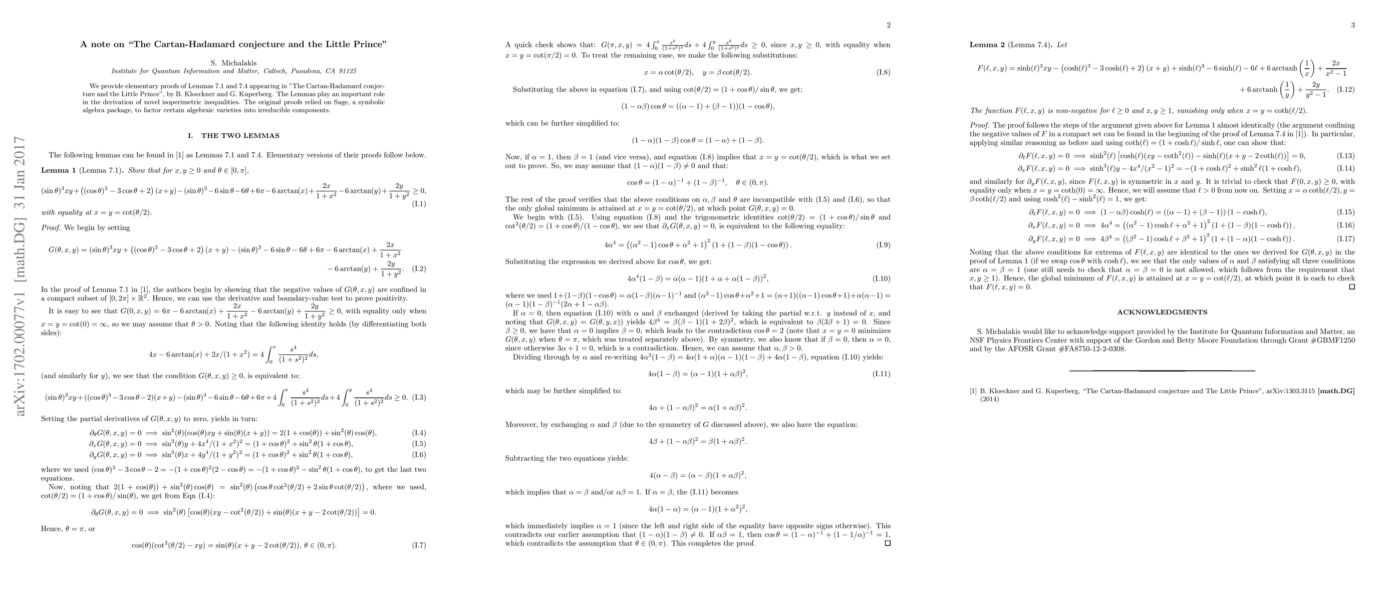 We provide elementary proofs of Lemmas 7.1 and 7.4 appearing in "The Cartan-Hadamard conjecture and the Little Prince", by B. Kloeckner and G. Kuperberg. The Lemmas play an important role in the derivation of novel isoperimetric inequalities. The original proofs relied on Sage, a symbolic algebra package, to factor certain algebraic varieties into irreducible components.