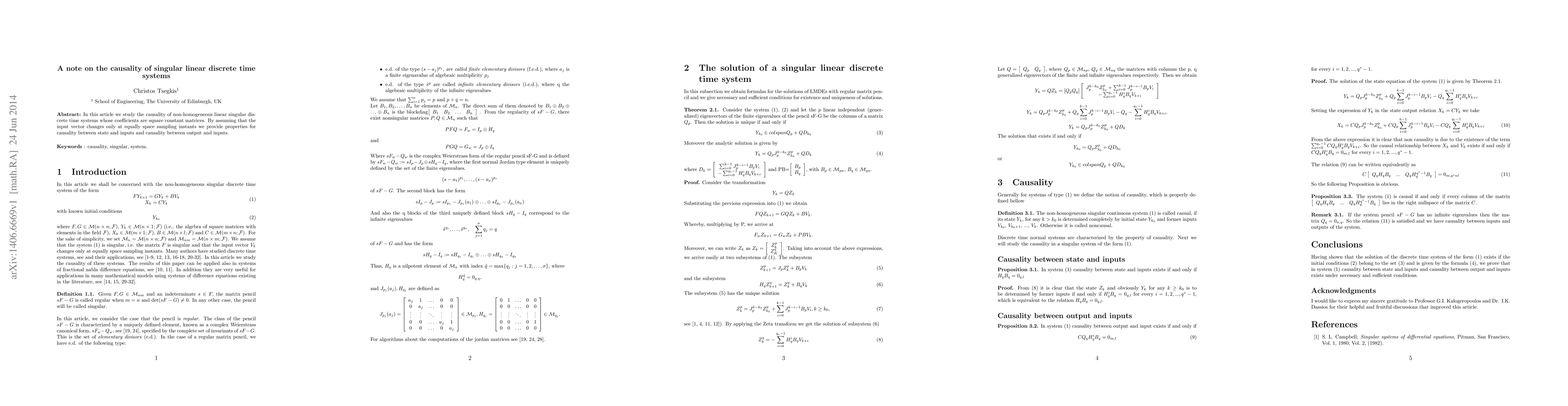 This paper investigates the causality of non-homogeneous linear singular discrete time systems with constant matrix coefficients, focusing on the relationship between state and input variables, as well as output and input variables under equally spaced sampling conditions.