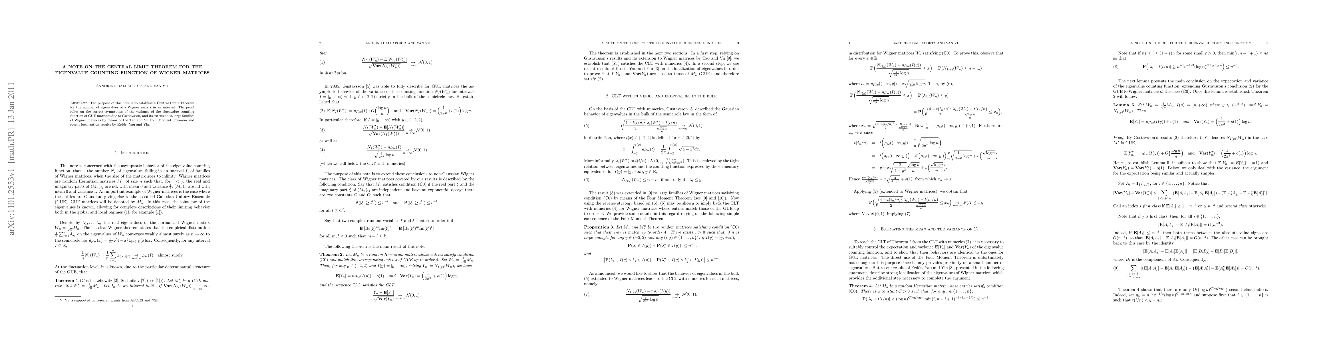 This paper establishes a Central Limit Theorem for the eigenvalue counting function of Wigner matrices, leveraging the asymptotic variance of GUE matrices and extending this via the Tao-Vu Four Moment Theorem and recent localization results by Erdős, Yau, and Yin.
