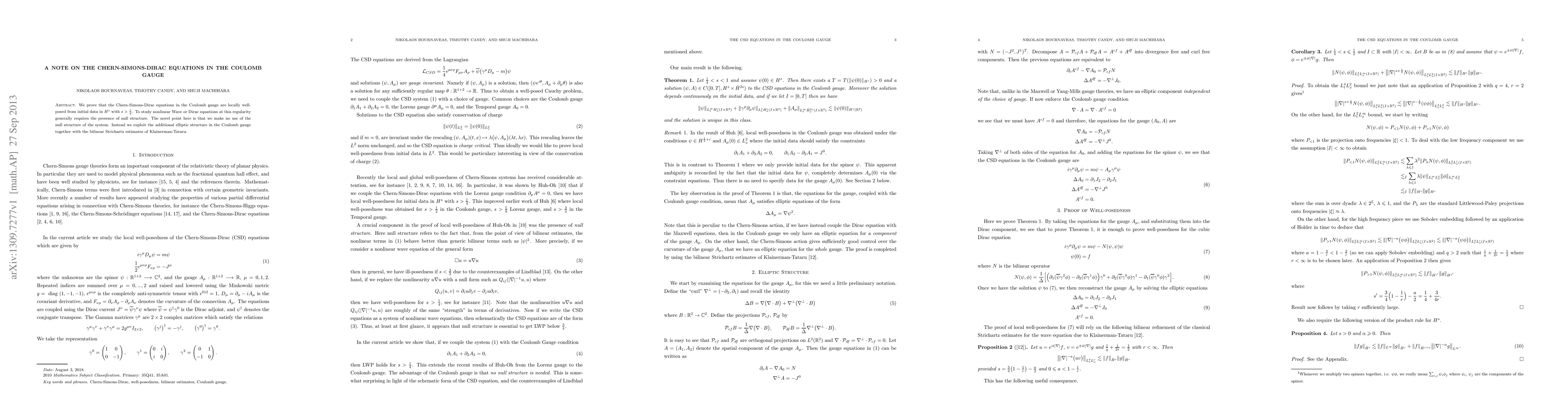 Summary: This paper proves local well-posedness for Chern-Simons-Dirac equations in the Coulomb gauge using initial data in H^s for s > 1/4, leveraging elliptic structure and bilinear Strichartz estimates instead of null structure typically required for such equations.