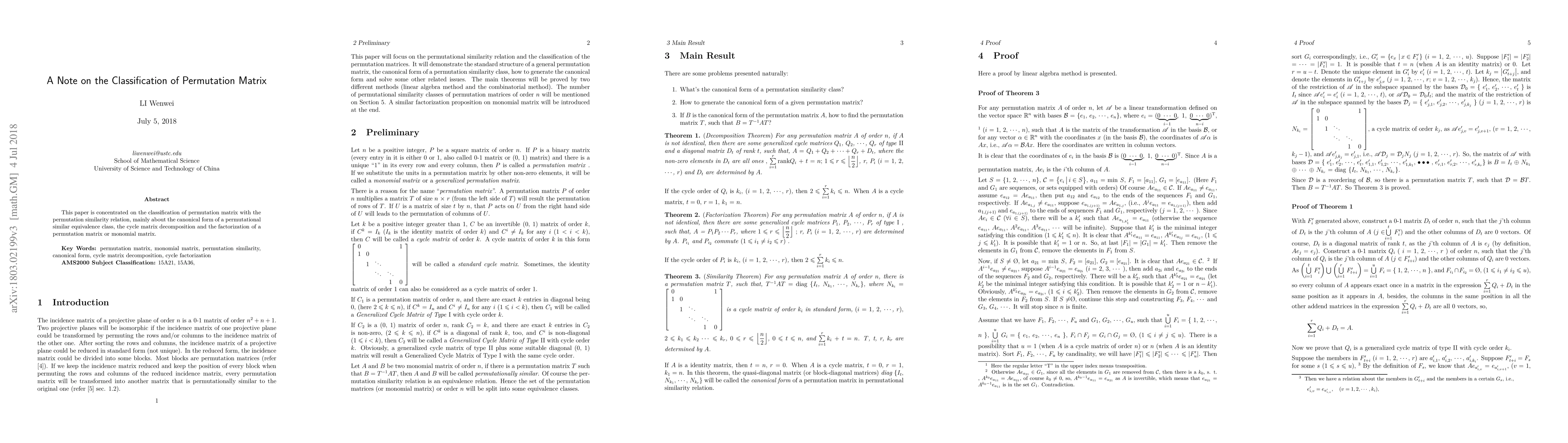 The paper presents a proof using linear algebra methods for the classification of permutation matrices, focusing on canonical form, cycle matrix decomposition, and cycle factorization of permutation matrices or monomial matrices.