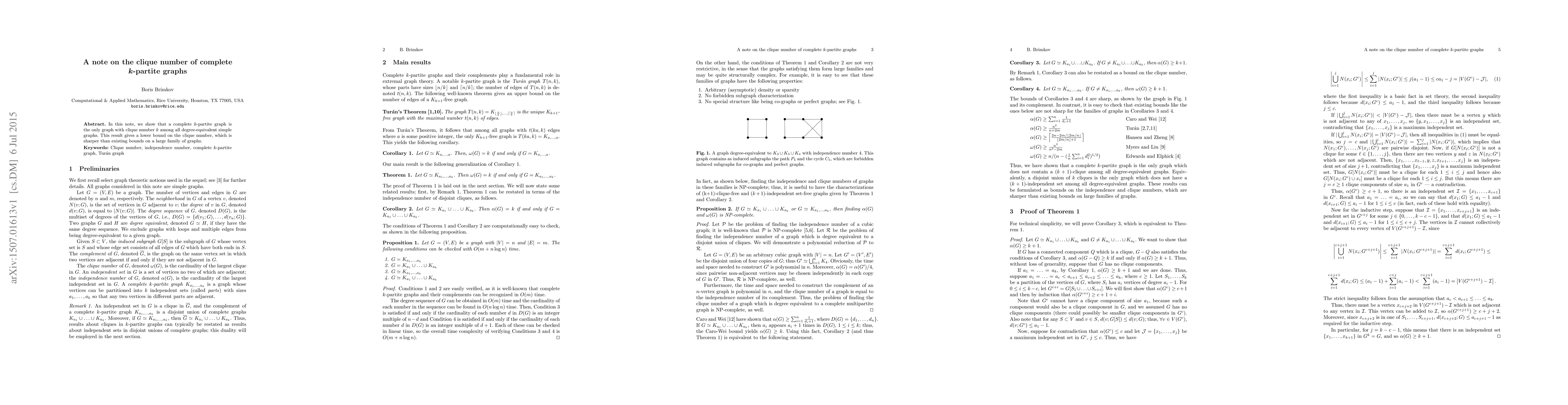 Summary: This paper demonstrates that complete $k$-partite graphs uniquely possess a clique number of $k$ among degree-equivalent simple graphs, providing a sharper lower bound on the clique number for a broad class of graphs.