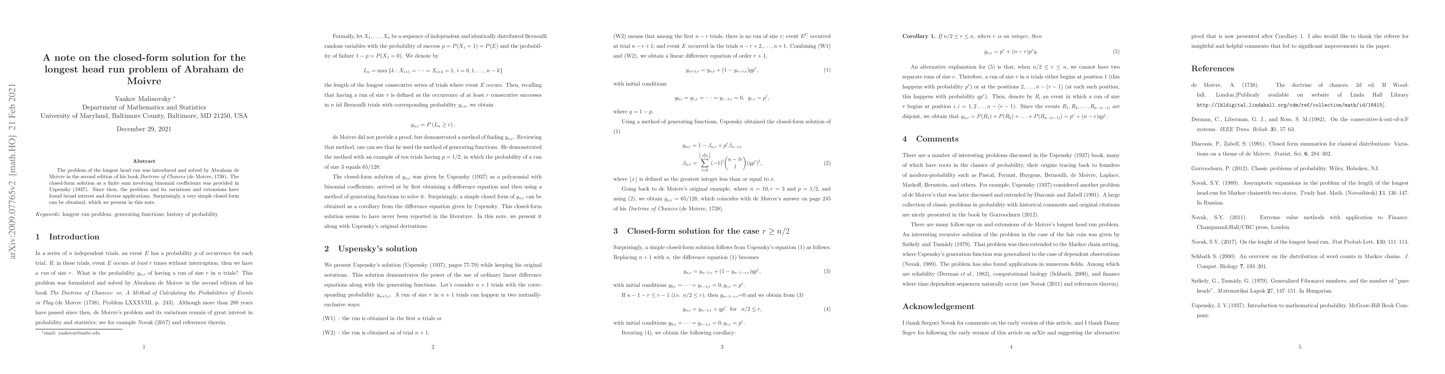 The problem of the longest head run was introduced and solved by Abraham de Moivre in the second edition of his book Doctrine of Chances (de Moivre, 1738). The closed-form solution as a finite sum involving binomial coefficients was provided in Uspensky (1937). Since then, the problem and its variations and extensions have found broad interest and diverse applications. Surprisingly, a very simple closed form can be obtained, which we present in this note.