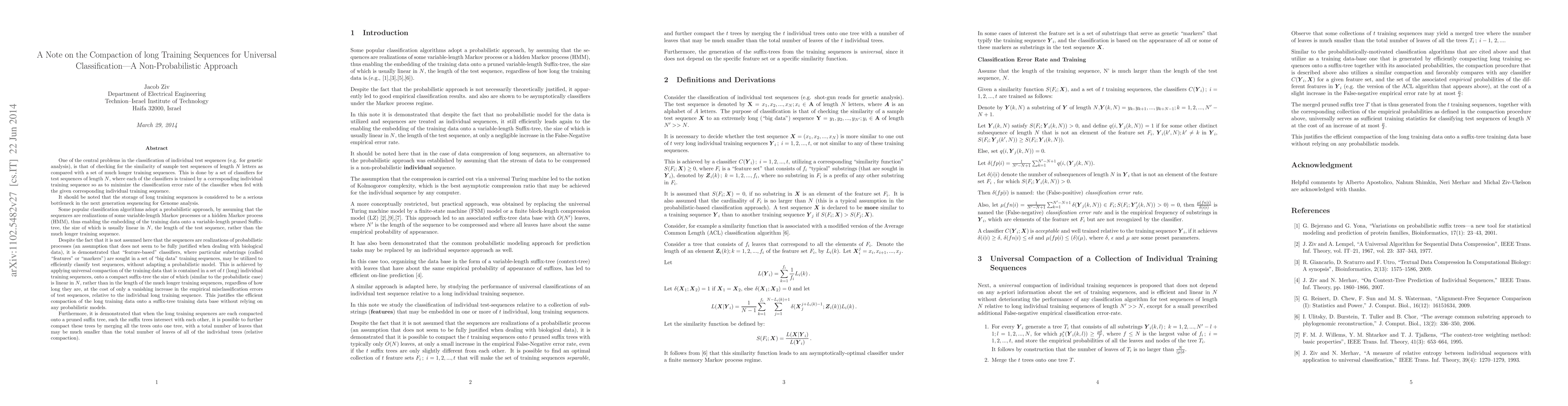This paper proposes a non-probabilistic approach for compacting long training sequences to classify test sequences, addressing the storage bottleneck in genome analysis. It demonstrates that "feature-based" classifiers can effectively reduce training data to a suffix-tree with O(N) leaves, maintaining minimal classification error.