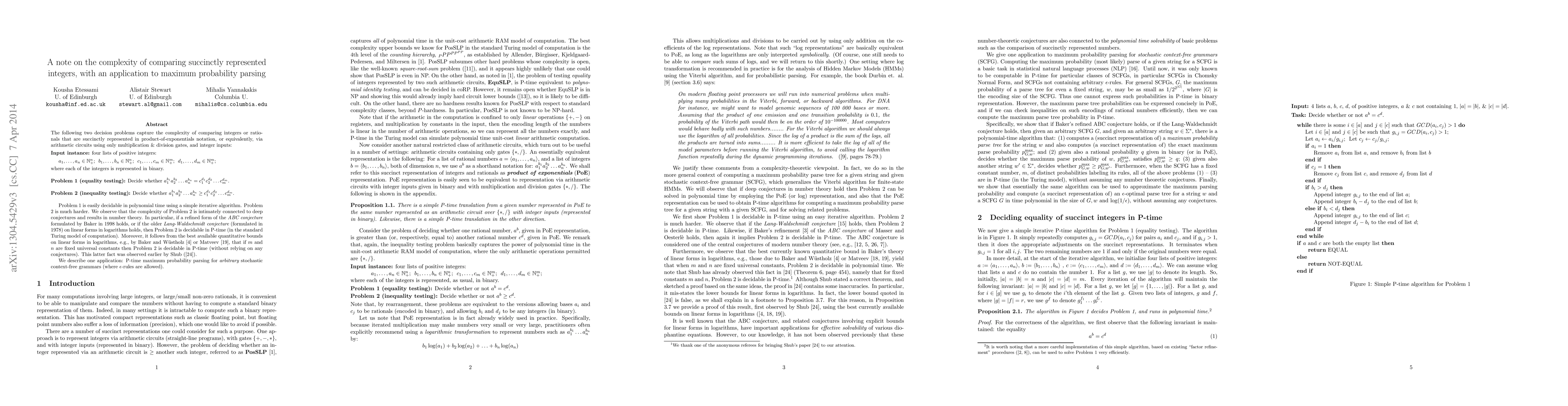 The following two decision problems capture the complexity of comparing integers or rationals that are succinctly represented in product-of-exponentials notation, or equivalently, via arithmetic circuits using only multiplication and division gates, and integer inputs: Input instance: four lists of positive integers: a_1, ...., a_n ; b_1,...., b_n ; c_1,....,c_m ; d_1, ...., d_m ; where each of the integers is represented in binary. Problem 1 (equality testing): Decide whether a_1^{b_1} a_2^{b_2} .... a_n^{b_n} = c_1^{d_1} c_2^{d_2} .... c_m^{d_m} . Problem 2 (inequality testing): Decide whether a_1^{b_1} a_2^{b_2} ... a_n^{b_n} >= c_1^{d_1} c_2^{d_2} .... c_m^{d_m} . Problem 1 is easily decidable in polynomial time using a simple iterative algorithm. Problem 2 is much harder. We observe that the complexity of Problem 2 is intimately connected to deep conjectures and results in number theory. In particular, if a refined form of the ABC conjecture formulated by Baker in 1998 holds, or if the older Lang-Waldschmidt conjecture (formulated in 1978) on linear forms in logarithms holds, then Problem 2 is decidable in P-time (in the standard Turing model of computation). Moreover, it follows from the best available quantitative bounds on linear forms in logarithms, e.g., by Baker and W\"{u}stholz (1993) or Matveev (2000), that if m and n are fixed universal constants then Problem 2 is decidable in P-time (without relying on any conjectures). This latter fact was observed earlier by Shub (1993). We describe one application: P-time maximum probability parsing for arbitrary stochastic context-free grammars (where \epsilon-rules are allowed).