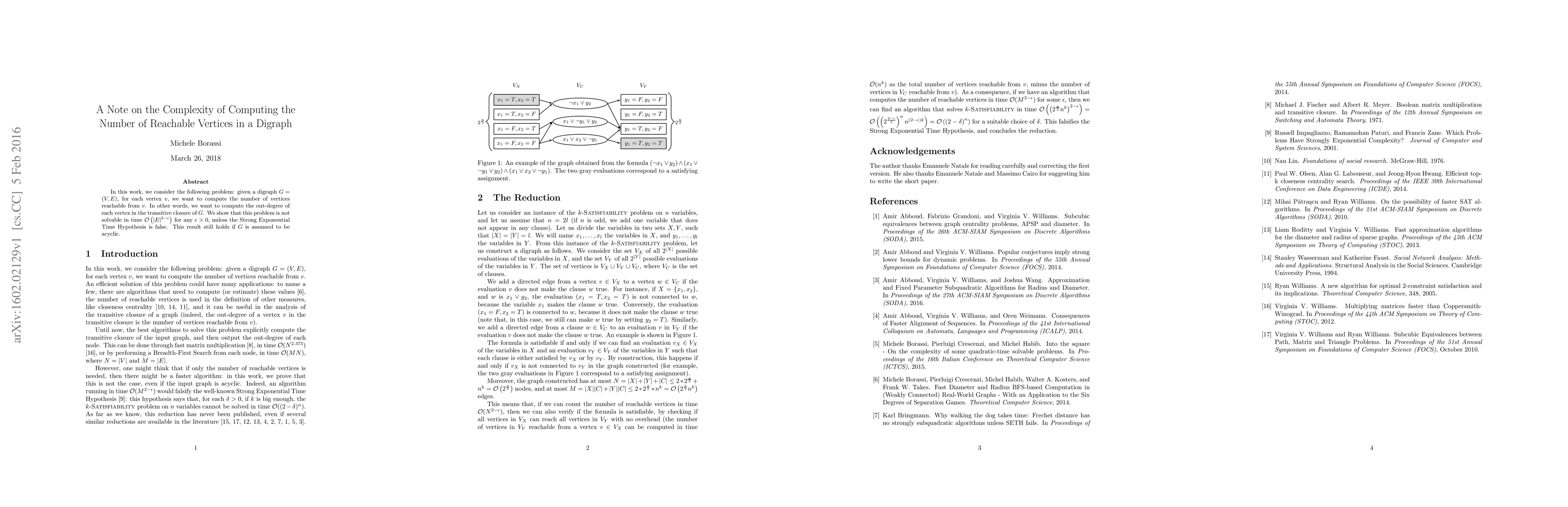 This paper demonstrates that computing the number of reachable vertices in a directed graph (digraph) is computationally hard, proving it cannot be solved in $\mathcal{O}\left(|E|^{2-\epsilon}\right)$ time for any $\epsilon>0$, unless the Strong Exponential Time Hypothesis fails. The result remains valid even for acyclic digraphs.
