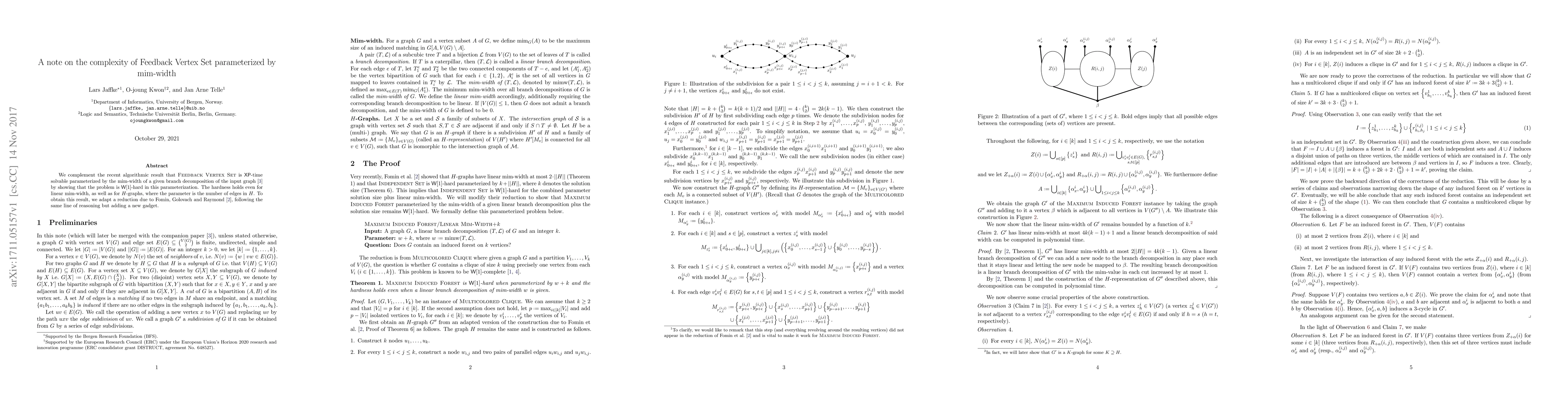This paper demonstrates that the Feedback Vertex Set problem remains W[1]-hard when parameterized by mim-width, despite being XP-time solvable under this parameterization. The authors show this holds true even for linear mim-width and H-graphs, adapting a reduction from previous work with an additional gadget.