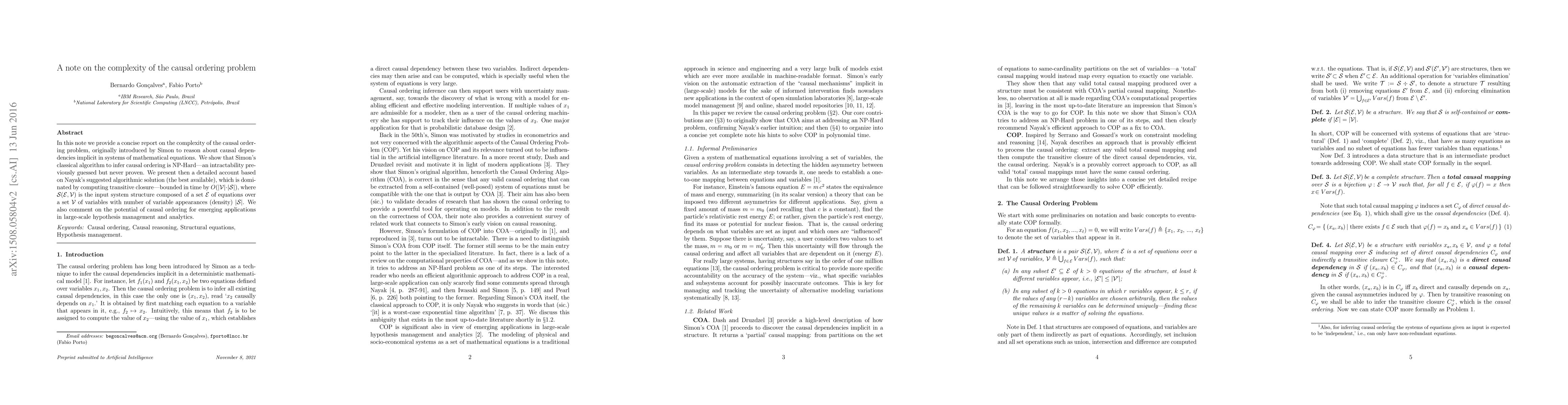 In this note we provide a concise report on the complexity of the causal ordering problem, originally introduced by Simon to reason about causal dependencies implicit in systems of mathematical equations. We show that Simon's classical algorithm to infer causal ordering is NP-Hard---an intractability previously guessed but never proven. We present then a detailed account based on Nayak's suggested algorithmic solution (the best available), which is dominated by computing transitive closure---bounded in time by $O(|\mathcal V|\cdot |\mathcal S|)$, where $\mathcal S(\mathcal E, \mathcal V)$ is the input system structure composed of a set $\mathcal E$ of equations over a set $\mathcal V$ of variables with number of variable appearances (density) $|\mathcal S|$. We also comment on the potential of causal ordering for emerging applications in large-scale hypothesis management and analytics.