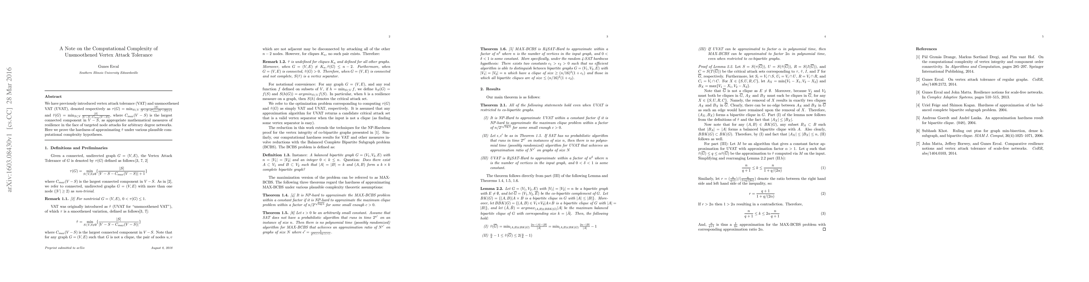We have previously introduced vertex attack tolerance (VAT) and unsmoothened VAT (UVAT), denoted respectively as $\tau(G) = \min_{S \subset V} \frac{|S|}{|V-S-C_{max}(V-S)|+1}$ and $\hat{\tau}(G) = \min_{S \subset V} \frac{|S|}{|V-S-C_{max}(V-S)|}$, where $C_{max}(V-S)$ is the largest connected component in $V-S$, as appropriate mathematical measures of resilience in the face of targeted node attacks for arbitrary degree networks. Here we prove the hardness of approximating $\hat{\tau}$ under various plausible computational complexity hypotheses.