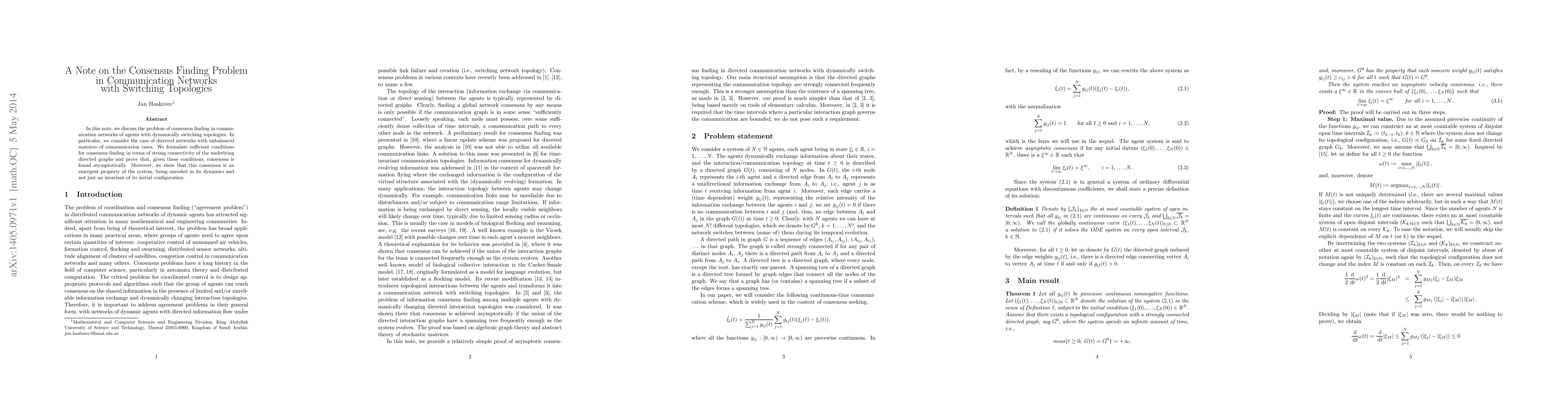 In this note, we discuss the problem of consensus finding in communication networks of agents with dynamically switching topologies. In particular, we consider the case of directed networks with unbalanced matrices of communication rates. We formulate sufficient conditions for consensus finding in terms of strong connectivity of the underlying directed graphs and prove that, given these conditions, consensus is found asymptotically. Moreover, we show that this consensus is an emergent property of the system, being encoded in its dynamics and not just an invariant of its initial configuration.