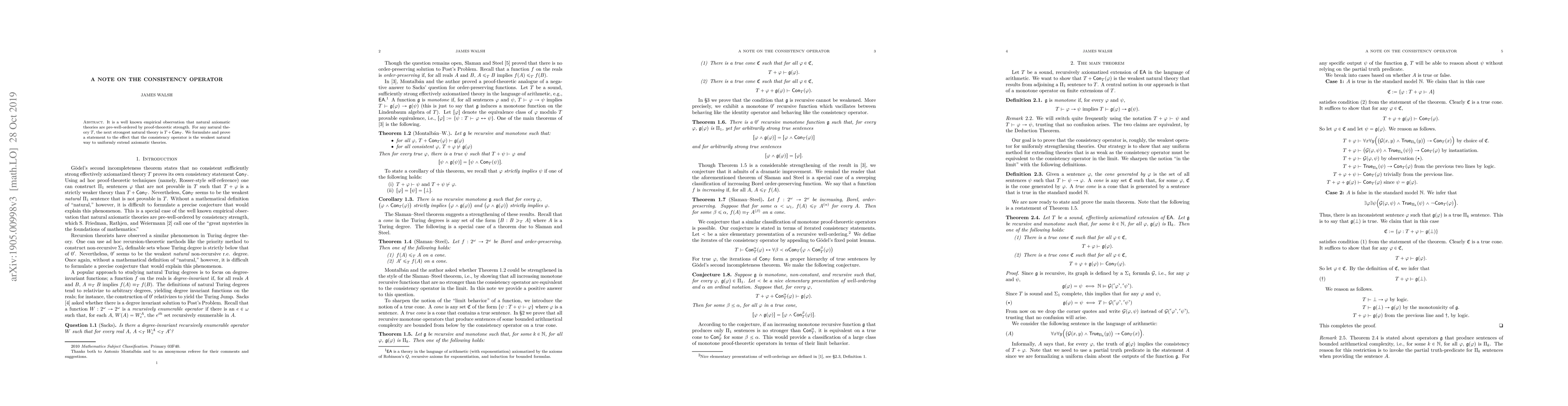 It is a well known empirical observation that natural axiomatic theories are pre-well-ordered by consistency strength. For any natural theory $T$, the next strongest natural theory is $T+\mathsf{Con}_T$. We formulate and prove a statement to the effect that the consistency operator is the weakest natural way to uniformly extend axiomatic theories.