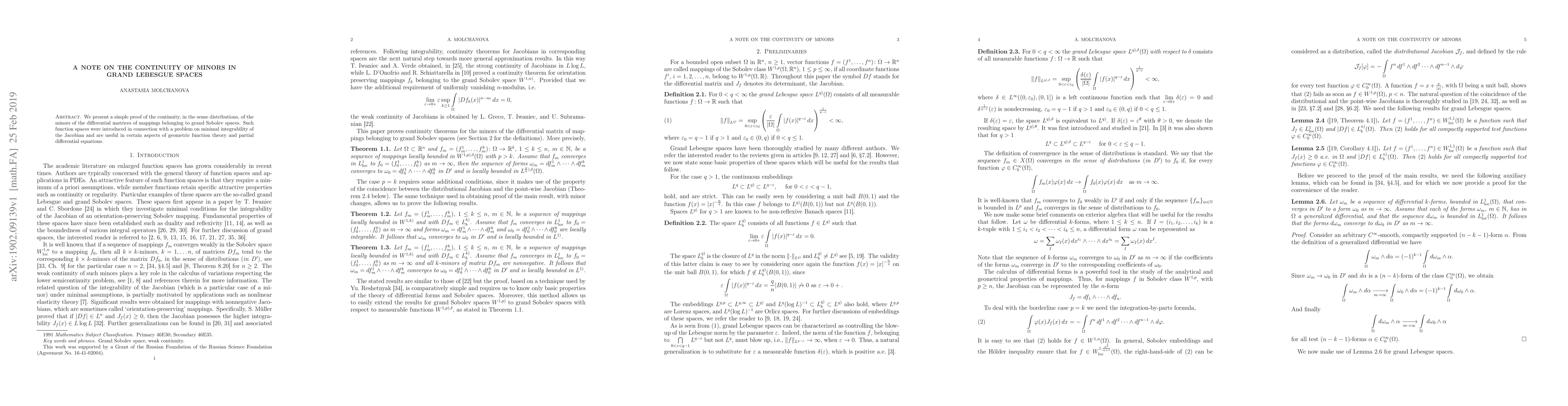 Summary: This paper provides a straightforward proof of the continuity of minors of differential matrices for mappings in grand Sobolev spaces, demonstrating their utility in geometric function theory and partial differential equations. The focus is on the minimal integrability of the Jacobian within these function spaces.