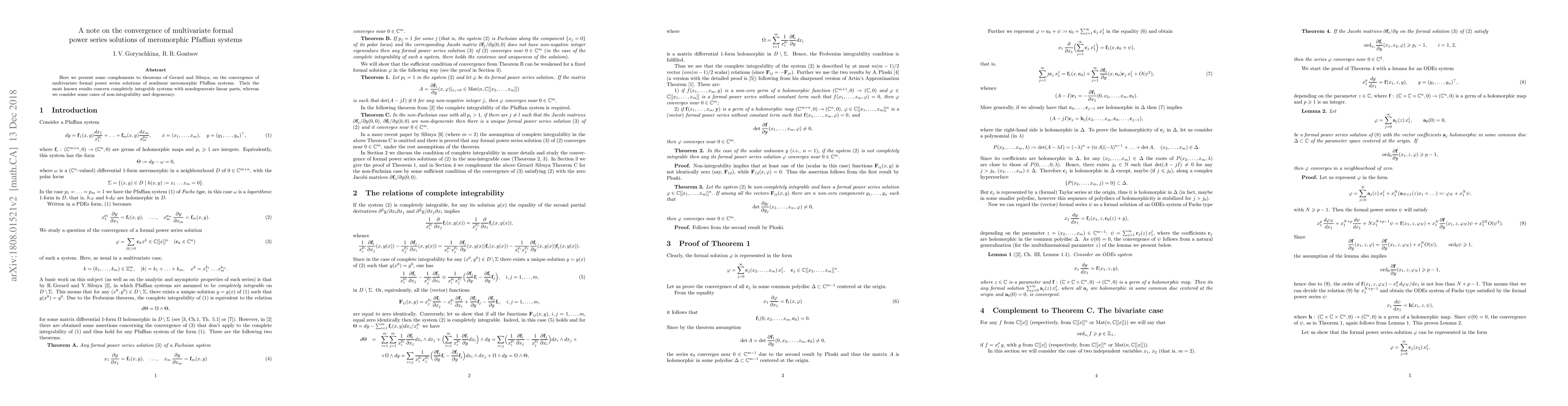Summary: This paper extends convergence theorems by Gerard and Sibuya for multivariate formal power series solutions of meromorphic Pfaffian systems, focusing on cases of non-integrability and degeneracy beyond the scope of their original work on completely integrable systems with nondegenerate linear parts.