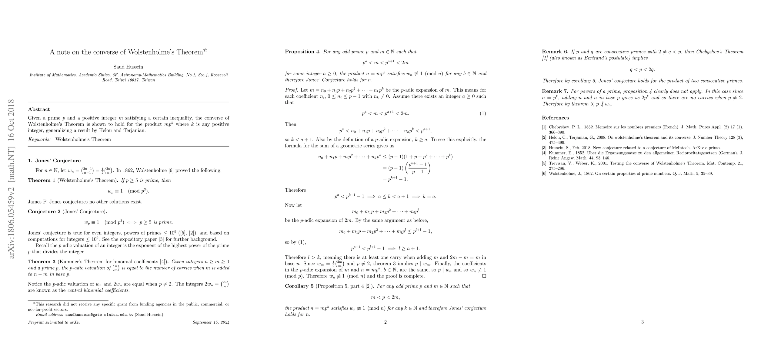 Summary: This paper demonstrates that the converse of Wolstenholme's Theorem holds for the product mp^k for any positive integer k, given a prime p and a positive integer m that satisfy a specific inequality, thereby generalizing a previous result by Helou and Terjanian.