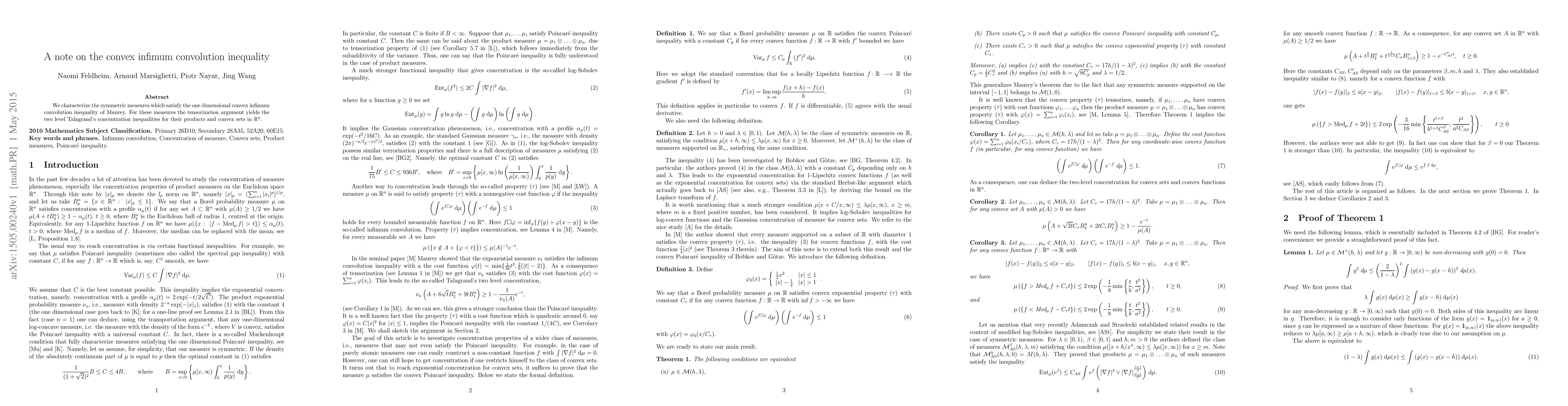 This paper characterizes symmetric measures that fulfill Maurey's one-dimensional convex infimum convolution inequality, and demonstrates that these measures lead to the tensorization of Talagrand's concentration inequalities for their products and convex sets in $\mathbb{R}^n$.