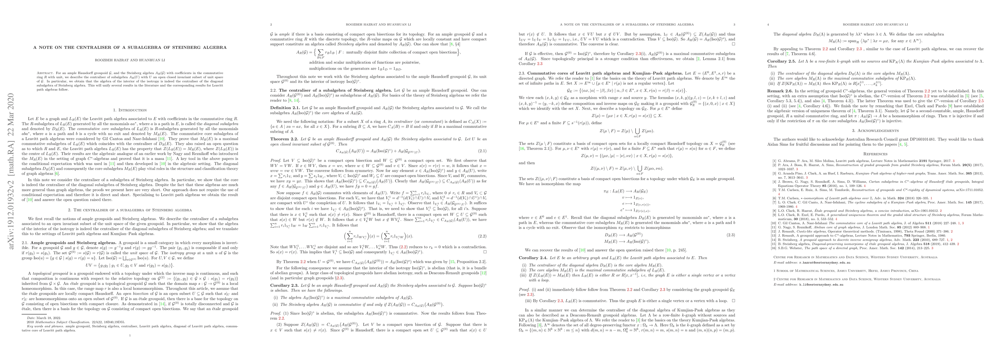 For an ample Hausdorff groupoid $G$, and the Steinberg algebra $A_R(G)$ with coefficients in the commutative ring $R$ with unit, we describe the centraliser of subalgebra $A_R(U)$ with $U$ an open closed invariant subset of unit space of $G$. In particular, we obtain that the algebra of the interior of the isotropy is indeed the centraliser of the diagonal subalgebra of Steinberg algebra. This will unify several results in the literature and the corresponding results for Leavitt path algebras follow.