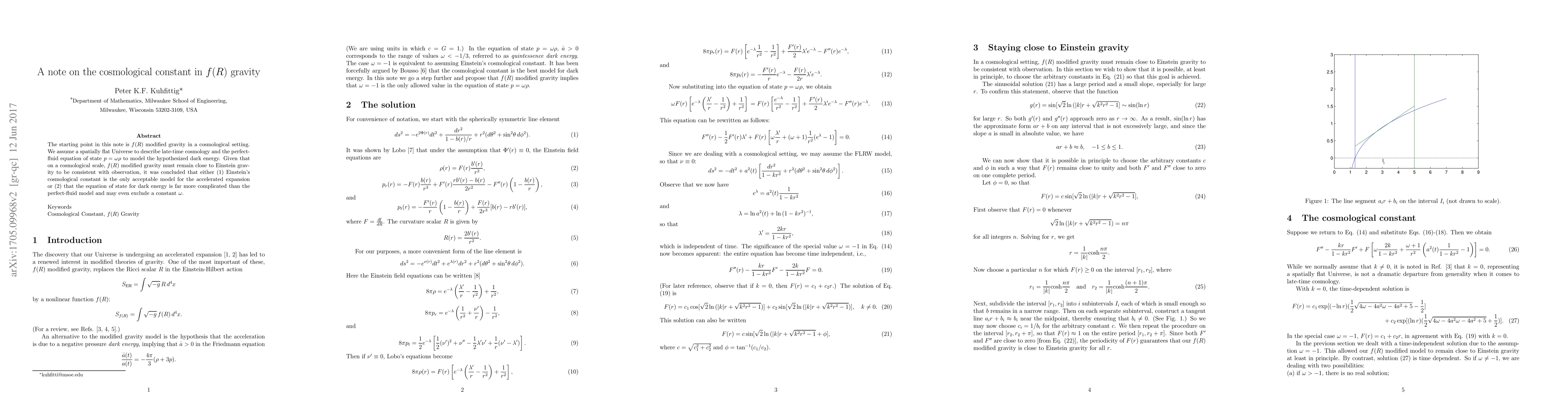 The starting point in this note is $f(R)$ modified gravity in a cosmological setting. We assume a spatially flat Universe to describe late-time cosmology and the perfect-fluid equation of state $p=\omega\rho$ to model the hypothesized dark energy. Given that on a cosmological scale, $f(R)$ modified gravity must remain close to Einstein gravity to be consistent with observation, it was concluded that either (1) Einstein's cosmological constant is the only acceptable model for the accelerated expansion or (2) that the equation of state for dark energy is far more complicated than the perfect-fluid model and may even exclude a constant $\omega$.