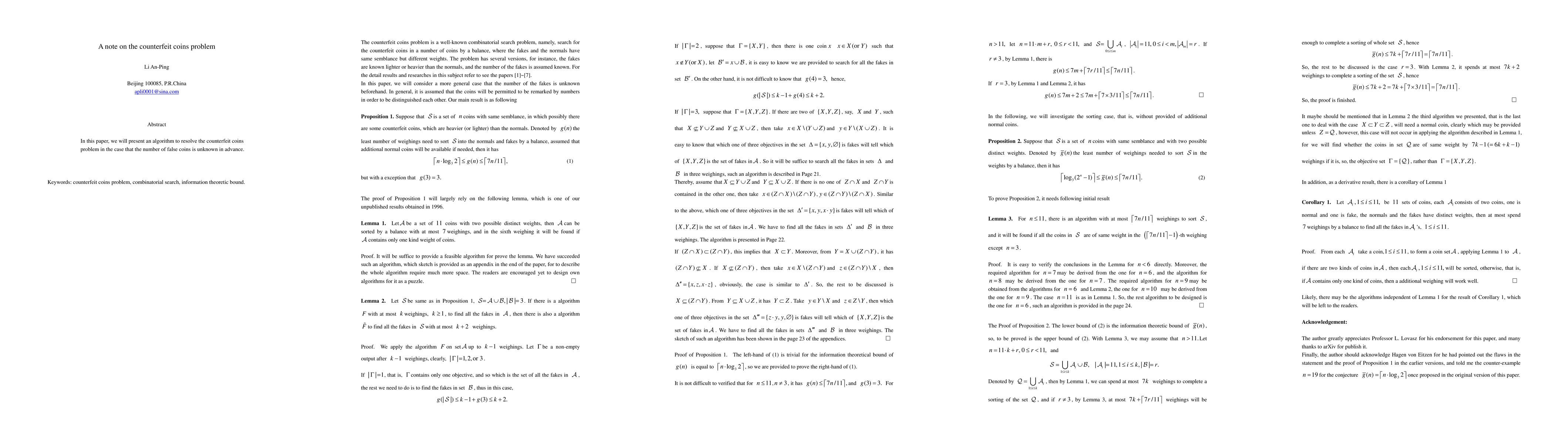 Summary: This paper introduces an algorithm to tackle the counterfeit coins problem when the exact number of counterfeit coins is unknown, providing a solution to identify the counterfeits efficiently.