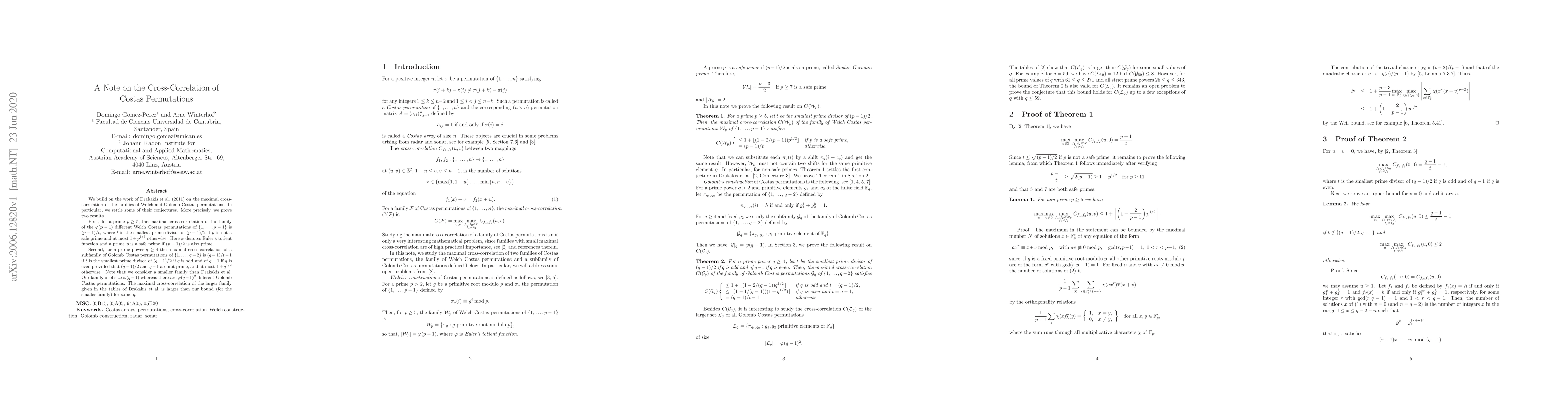 We build on the work of Drakakis et al. (2011) on the maximal cross-correlation of the families of Welch and Golomb Costas permutations. In particular, we settle some of their conjectures. More precisely, we prove two results. First, for a prime $p\ge 5$, the maximal cross-correlation of the family of the $\varphi(p-1)$ different Welch Costas permutations of $\{1,\ldots,p-1\}$ is $(p-1)/t$, where $t$ is the smallest prime divisor of $(p-1)/2$ if $p$ is not a safe prime and at most $1+p^{1/2}$ otherwise. Here $\varphi$ denotes Euler's totient function and a prime $p$ is a safe prime if $(p-1)/2$ is also prime. Second, for a prime power $q\ge 4$ the maximal cross-correlation of a subfamily of Golomb Costas permutations of $\{1,\ldots,q-2\}$ is $(q-1)/t-1$ if $t$ is the smallest prime divisor of $(q-1)/2$ if $q$ is odd and of $q-1$ if $q$ is even provided that $(q-1)/2$ and $q-1$ are not prime, and at most $1+q^{1/2}$ otherwise. Note that we consider a smaller family than Drakakis et al. Our family is of size $\varphi(q-1)$ whereas there are $\varphi(q-1)^2$ different Golomb Costas permutations. The maximal cross-correlation of the larger family given in the tables of Drakakis et al. is larger than our bound (for the smaller family) for some $q$.