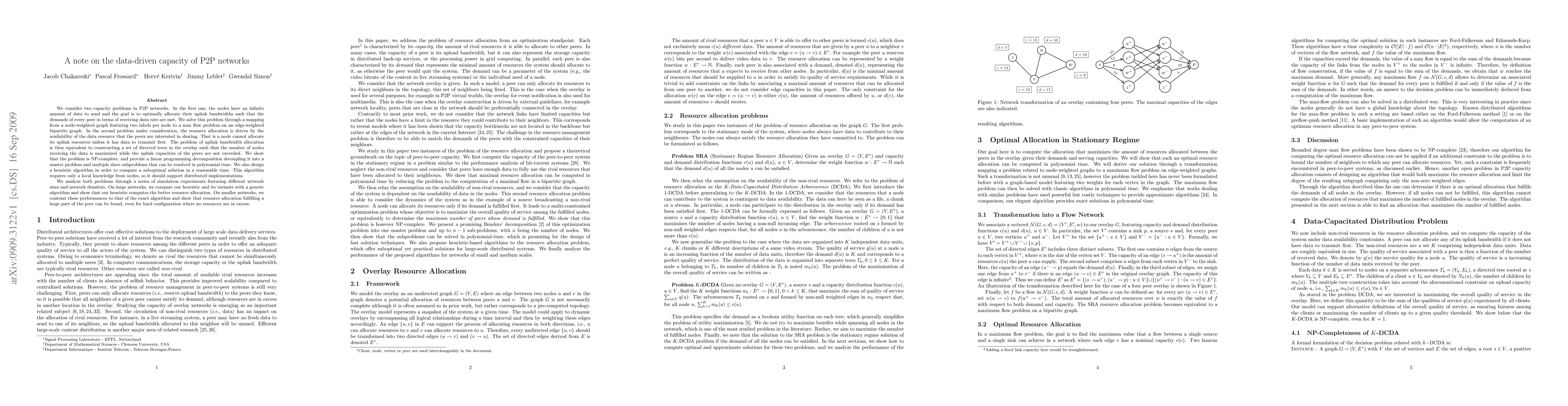 We consider two capacity problems in P2P networks. In the first one, the nodes have an infinite amount of data to send and the goal is to optimally allocate their uplink bandwidths such that the demands of every peer in terms of receiving data rate are met. We solve this problem through a mapping from a node-weighted graph featuring two labels per node to a max flow problem on an edge-weighted bipartite graph. In the second problem under consideration, the resource allocation is driven by the availability of the data resource that the peers are interested in sharing. That is a node cannot allocate its uplink resources unless it has data to transmit first. The problem of uplink bandwidth allocation is then equivalent to constructing a set of directed trees in the overlay such that the number of nodes receiving the data is maximized while the uplink capacities of the peers are not exceeded. We show that the problem is NP-complete, and provide a linear programming decomposition decoupling it into a master problem and multiple slave subproblems that can be resolved in polynomial time. We also design a heuristic algorithm in order to compute a suboptimal solution in a reasonable time. This algorithm requires only a local knowledge from nodes, so it should support distributed implementations. We analyze both problems through a series of simulation experiments featuring different network sizes and network densities. On large networks, we compare our heuristic and its variants with a genetic algorithm and show that our heuristic computes the better resource allocation. On smaller networks, we contrast these performances to that of the exact algorithm and show that resource allocation fulfilling a large part of the peer can be found, even for hard configuration where no resources are in excess.