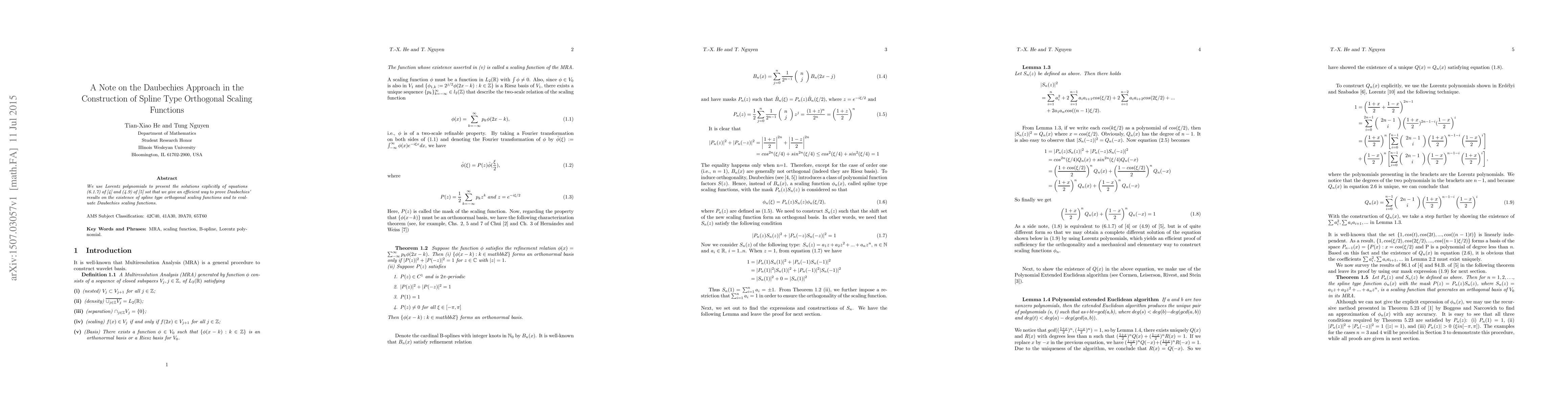 We use Lorentz polynomials to present the solutions explicitly of equations (6.1.7) of [I. Daubechies, Ten lectures on wavelets, CBMS-NSF Regional Conference Series in Applied Mathematics, 61. Society for Industrial and Applied Mathematics (SIAM), Philadelphia, PA, 1992] and (4.9) of [I. Daubechies, Orthonormal bases of compactly supported wavelets. Comm. Pure Appl. Math. 41 (1988), no. 7, 909--996] sot that we give an efficient way to prove Daubechies' results on the existence of spline type orthogonal scaling functions and to evaluate Daubechies scaling functions.