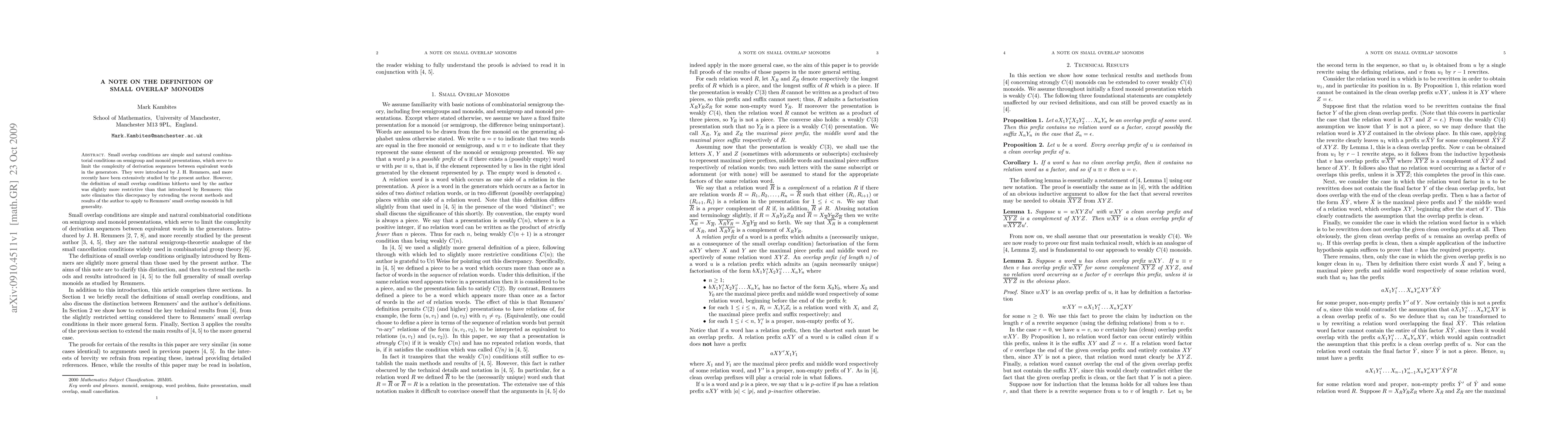 Small overlap conditions are simple and natural combinatorial conditions on semigroup and monoid presentations, which serve to limit the complexity of derivation sequences between equivalent words in the generators. They were introduced by J.H.Remmers, and more recently have been extensively studied by the present author. However, the definition of small overlap conditions hitherto used by the author was slightly more restrictive than that introduced by Remmers; this note eliminates this discrepancy by extending the recent methods and results of the author to apply to Remmers' small overlap monoids in full generality.