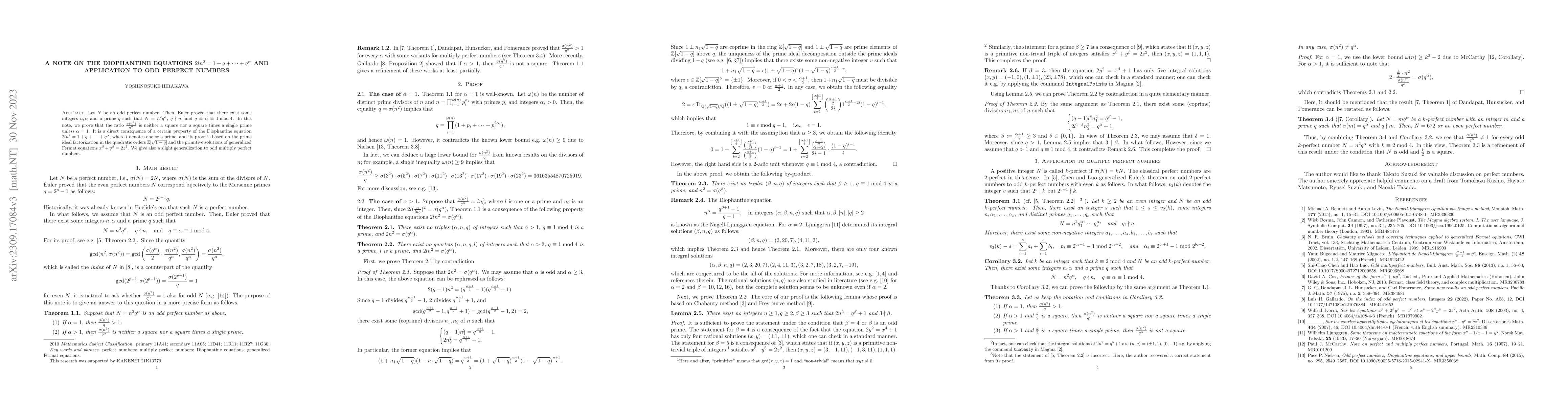 Let $N$ be an odd perfect number. Then, Euler proved that there exist some integers $n, \alpha$ and a prime $q$ such that $N = n^{2}q^{\alpha}$, $q \nmid n$, and $q \equiv \alpha \equiv 1 \bmod 4$. In this note, we prove that the ratio $\frac{\sigma(n^{2})}{q^{\alpha}}$ is neither a square nor a square times a single prime unless $\alpha = 1$. It is a direct consequence of a certain property of the Diophantine equation $2ln^{2} = 1+q+ \cdots +q^{\alpha}$, where $l$ denotes one or a prime, whose proof is based on the prime ideal factorization in the quadratic orders $\mathbb{Z}[\sqrt{1-q}]$ and the primitive solutions of generalized Fermat equations $x^{\beta}+y^{\beta} = 2z^{2}$. We give also a slight generalization to odd multiply perfect numbers.