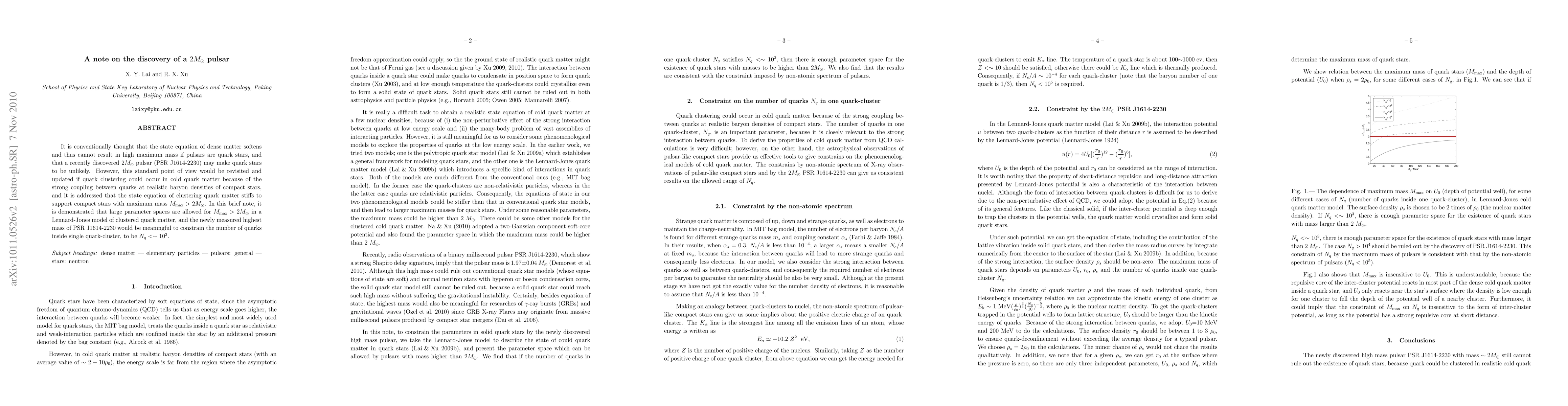 It is conventionally thought that the state equation of dense matter softens and thus cannot result in high maximum mass if pulsars are quark stars, and that a recently discovered $2M_\odot$ pulsar (PSR J1614-2230) may make quark stars to be unlikely. However, this standard point of view would be revisited and updated if quark clustering could occur in cold quark matter because of the strong coupling between quarks at realistic baryon densities of compact stars, and it is addressed that the state equation of clustering quark matter stiffs to support compact stars with maximum mass $M_{\rm max}>2M_\odot$. In this brief note, it is demonstrated that large parameter spaces are allowed for $M_{\rm max}>2M_\odot$ in a Lennard-Jones model of clustered quark matter, and the newly measured highest mass of PSR J1614-2230 would be meaningful to constrain the number of quarks inside single quark-cluster, to be $N_q<\sim 10^3$.