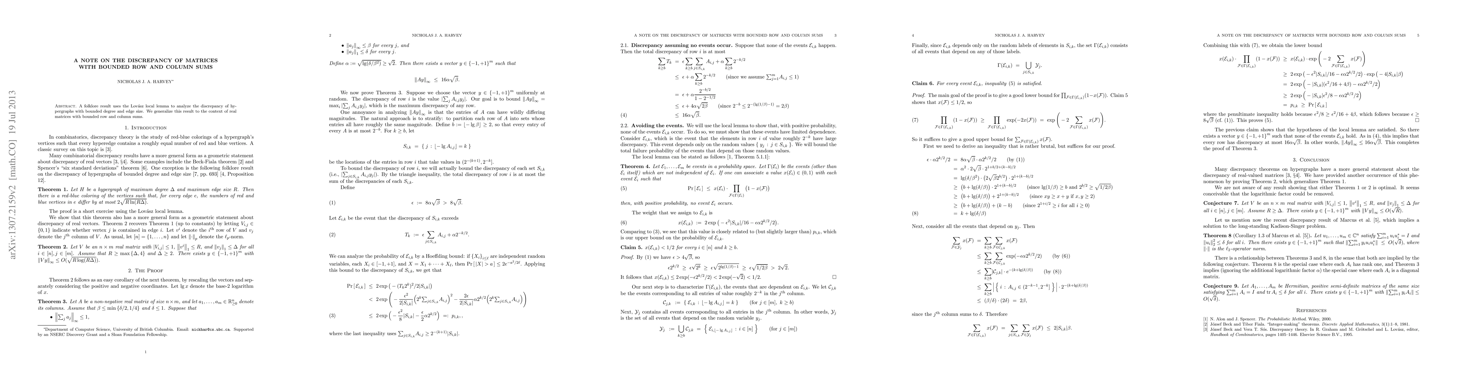 A folklore result uses the Lovasz local lemma to analyze the discrepancy of hypergraphs with bounded degree and edge size. We generalize this result to the context of real matrices with bounded row and column sums.