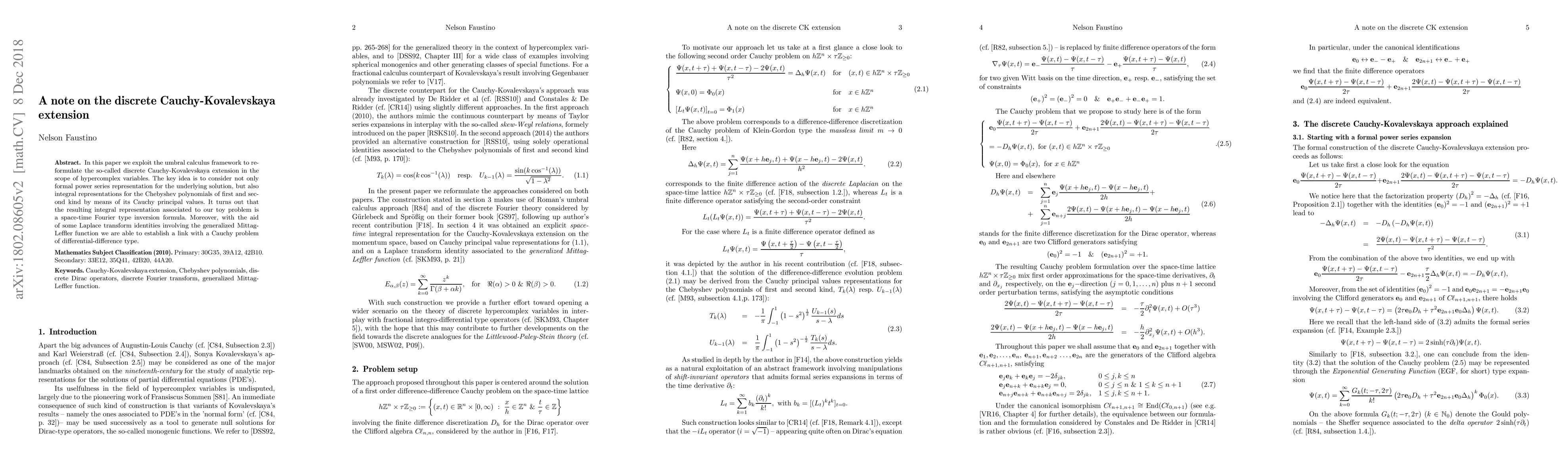 In this paper we exploit the umbral calculus framework to reformulate the so-called discrete Cauchy-Kovalevskaya extension in the scope of hypercomplex variables. The key idea is to consider not only formal power series representation for the underlying solution, but also integral representations for the Chebyshev polynomials of first and second kind by means of its Cauchy principal values. It turns out that the resulting integral representation associated to our toy problem is a space-time Fourier type inversion formula. Moreover, with the aid of some Laplace transform identities involving the generalized Mittag-Leffler function we are able to establish a link with a Cauchy problem of differential-difference type.