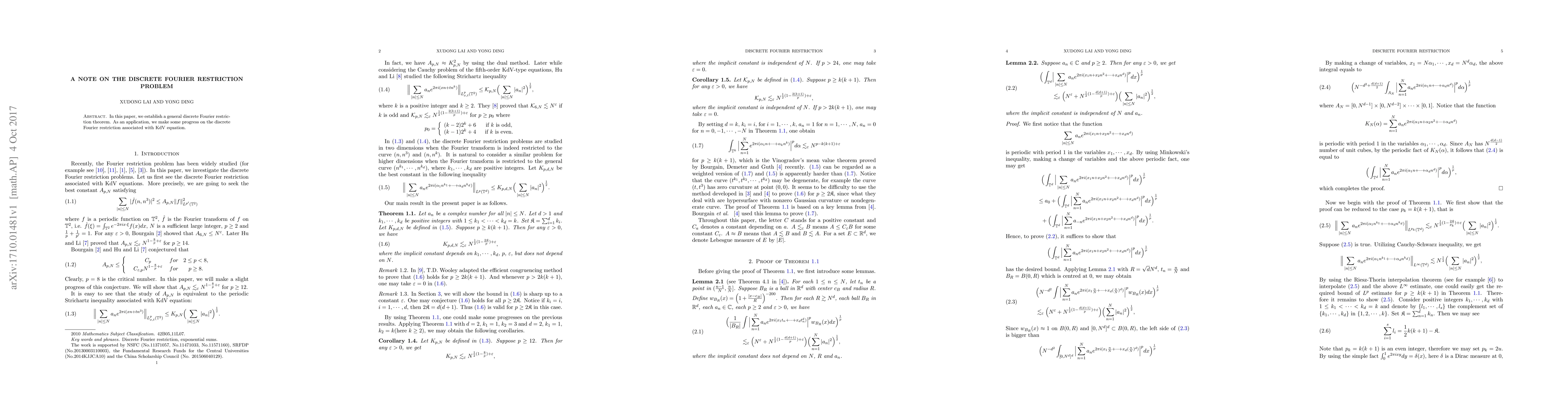 This paper establishes a general discrete Fourier restriction theorem and applies it to make progress on the discrete Fourier restriction problem associated with the KdV equation.