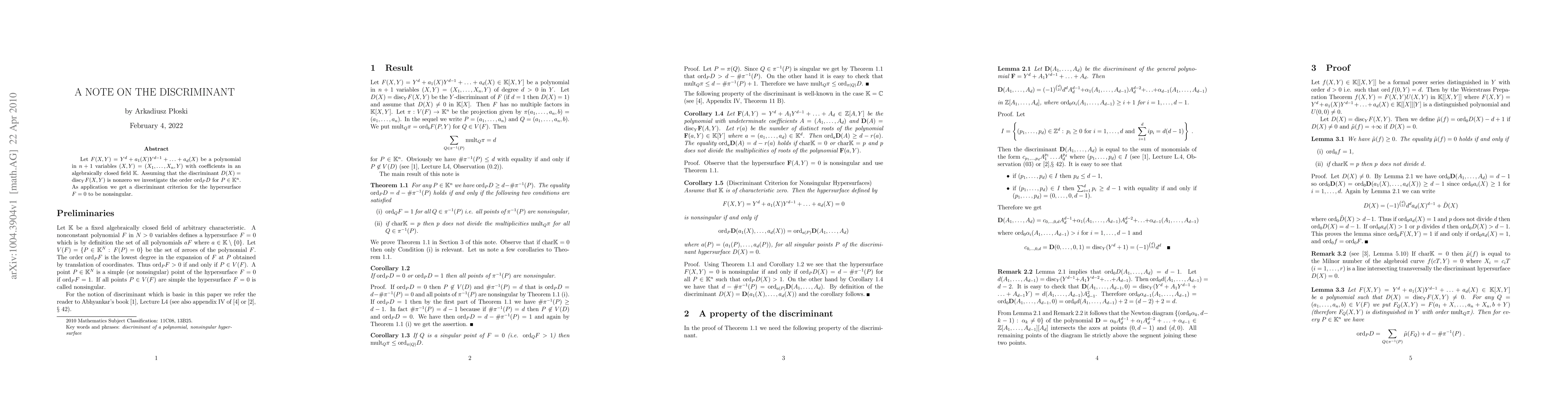 This paper investigates the order of the discriminant $D(X)$ for a polynomial $F(X,Y)$ in $(n+1)$ variables over an algebraically closed field, with implications for determining nonsingularity of hypersurfaces.