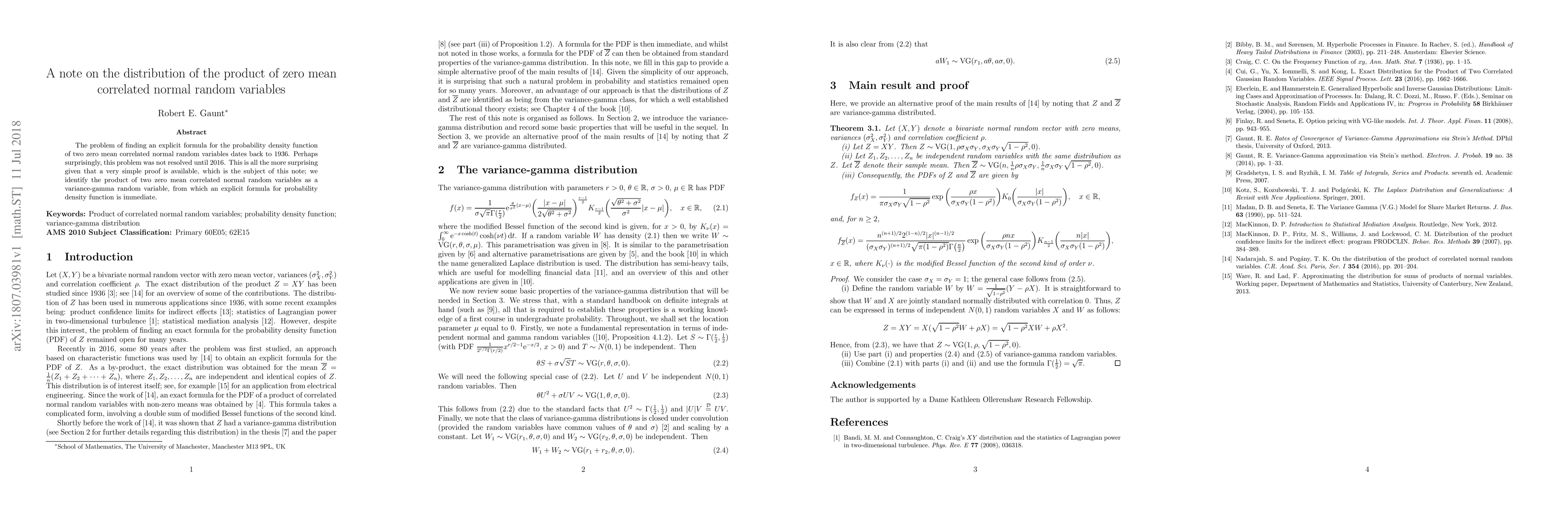 The paper provides a simple proof identifying the product of two zero mean correlated normal random variables as a variance-gamma random variable, leading to an explicit formula for its probability density function.
