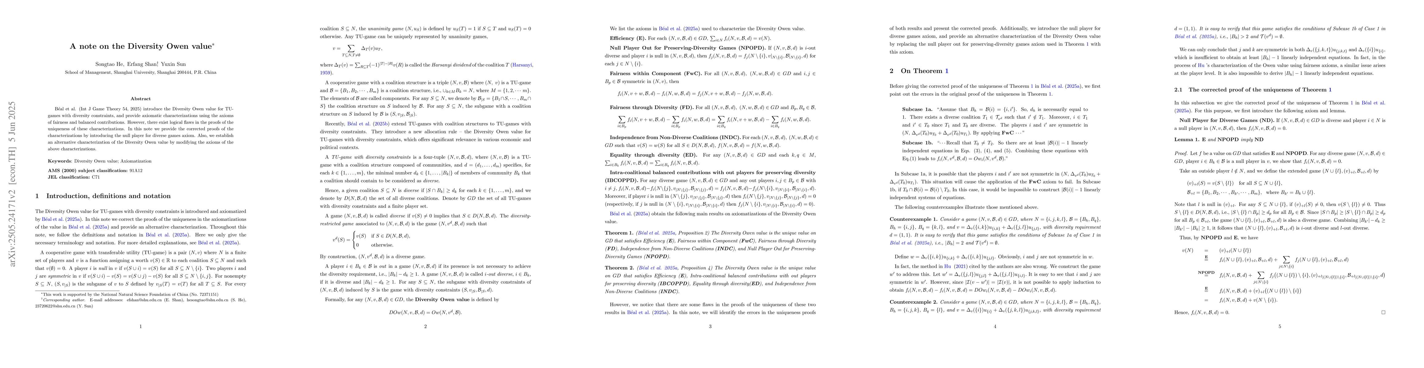 Researchers correct logical flaws in characterizations of the Diversity Owen value for TU-games with diversity constraints, introducing a new axiom to ensure uniqueness.