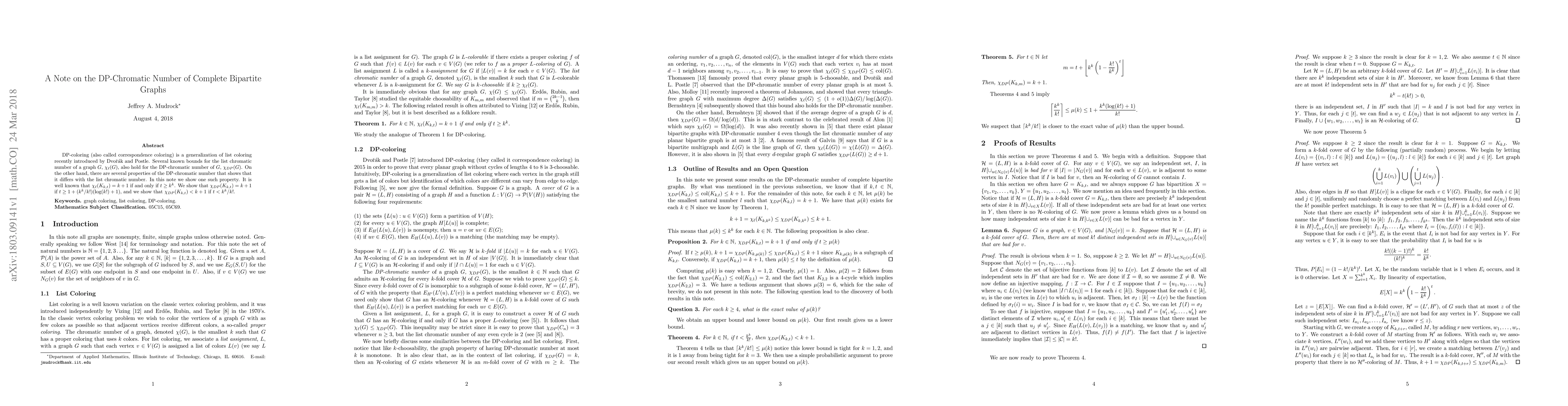 This paper explores the DP-chromatic number of complete bipartite graphs, demonstrating that it differs from the list chromatic number. It establishes a new bound for $\chi_{DP}(K_{k,t})$, showing it equals $k+1$ when $t \geq 1 + (k^k/k!)(\log(k!)+1)$, contrasting with the list chromatic number bound.