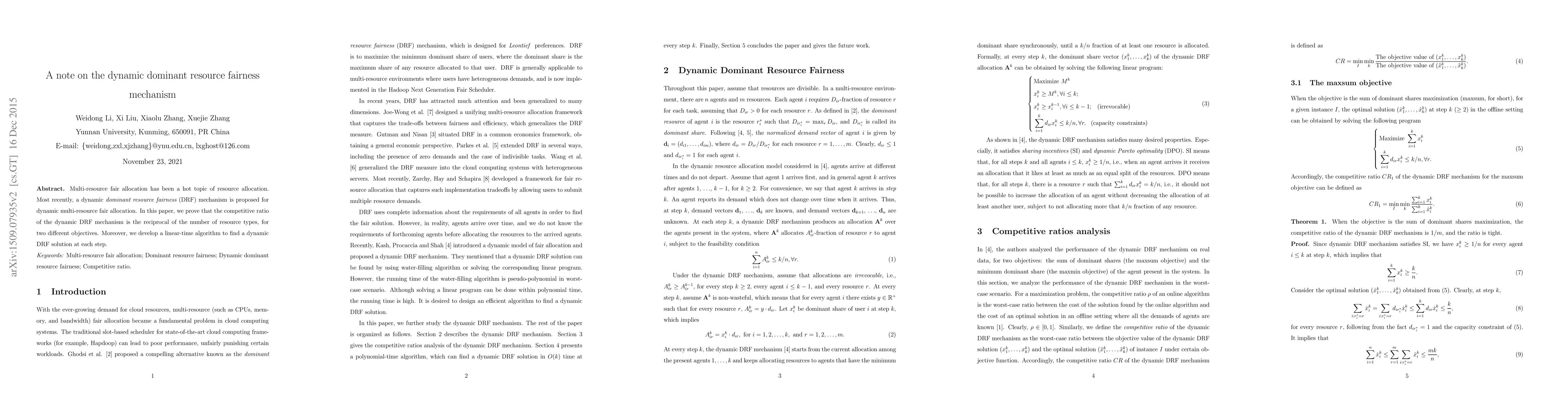 This paper introduces a dynamic dominant resource fairness (DRF) mechanism for dynamic multi-resource fair allocation, proving its competitive ratio and presenting a linear-time algorithm for finding DRF solutions at each step. The competitive ratio is shown to be the reciprocal of the number of resource types.