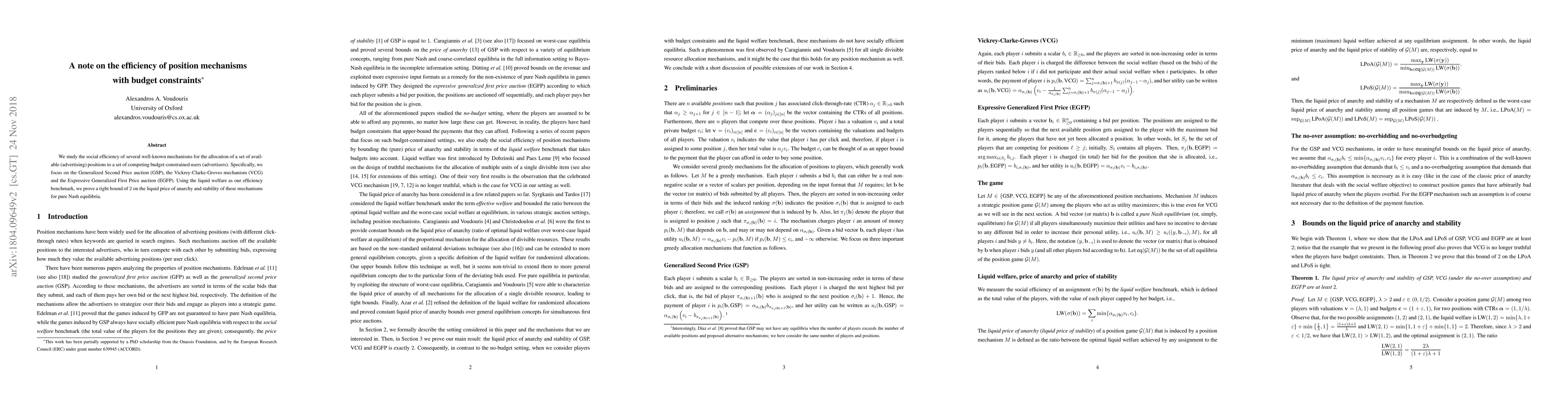 This paper evaluates the social efficiency of three position allocation mechanisms—GSP, VCG, and EGFP—under budget constraints for advertisers. It establishes a tight bound of 2 on the liquid price of anarchy, demonstrating stability in pure Nash equilibria.