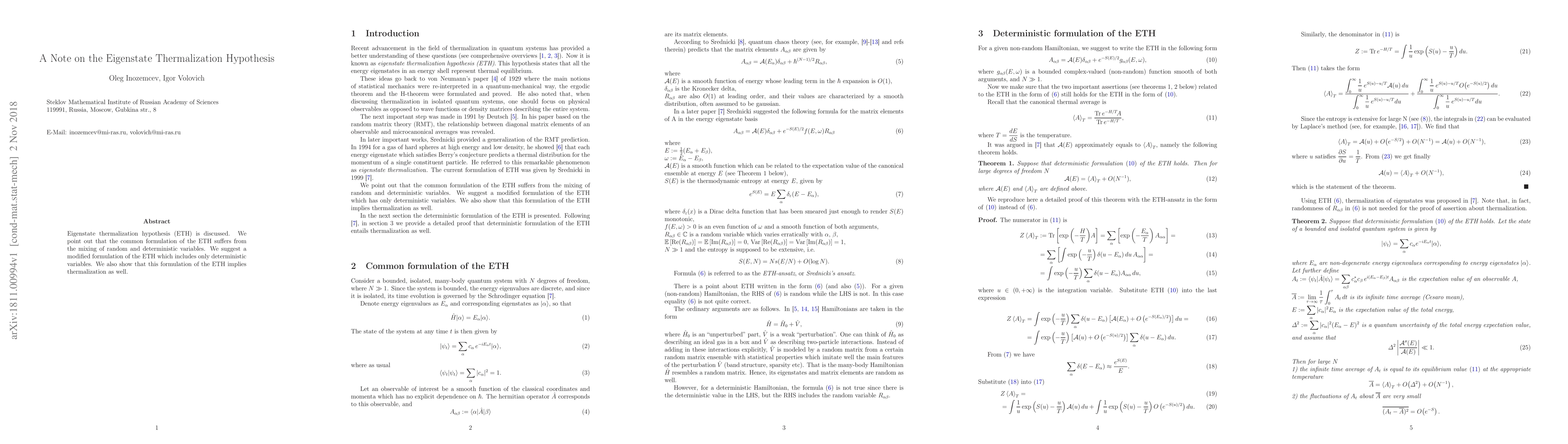 The paper critiques the conventional eigenstate thermalization hypothesis (ETH) for mixing random and deterministic variables, proposing a revised version that relies solely on deterministic elements, which still ensures thermalization.