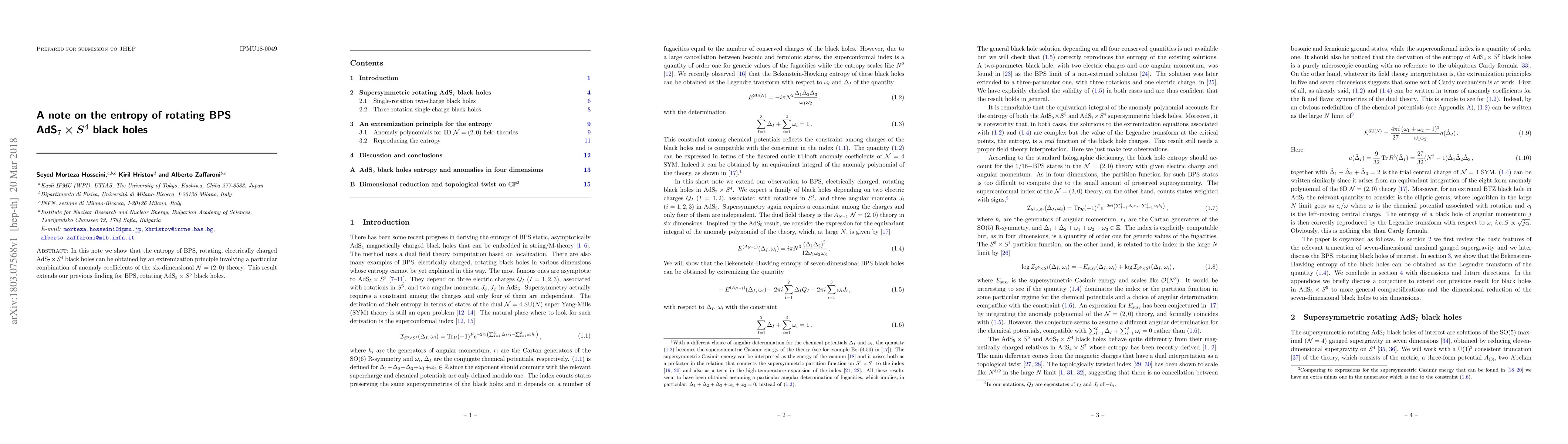 Summary: This note demonstrates that the entropy of BPS, rotating, electrically charged AdS$_7\times S^4$ black holes is determined through an extremization principle based on anomaly coefficients from a six-dimensional $\mathcal{N} = (2, 0)$ theory, extending earlier results for AdS$_5\times S^5$ black holes.