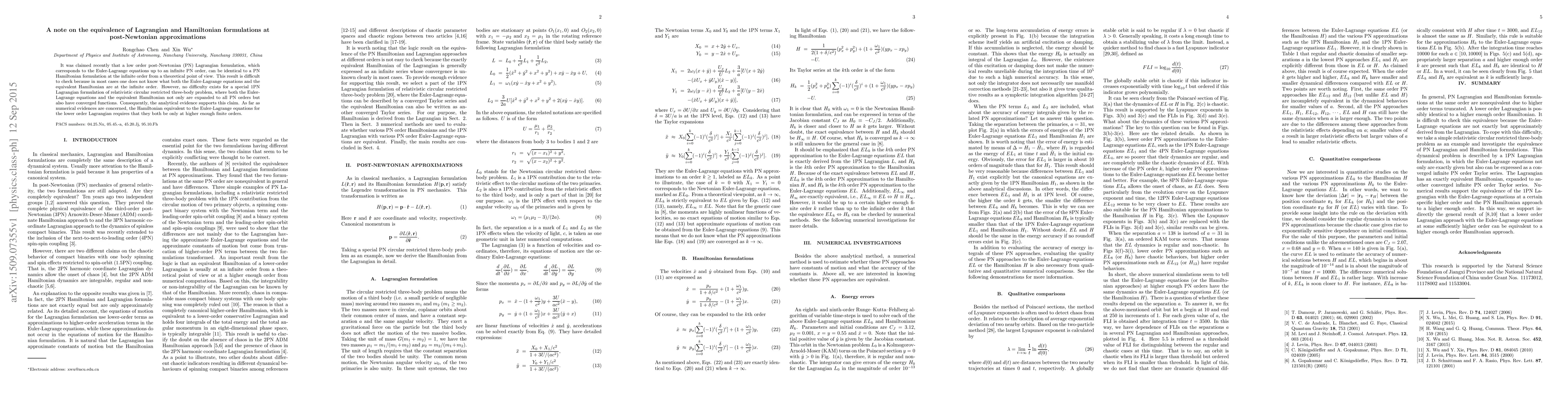 A recent study confirms that a low-order post-Newtonian Lagrangian formulation can be equivalent to a Hamiltonian formulation at infinite order for the relativistic circular restricted three-body problem. The evidence supports this claim both theoretically and numerically.