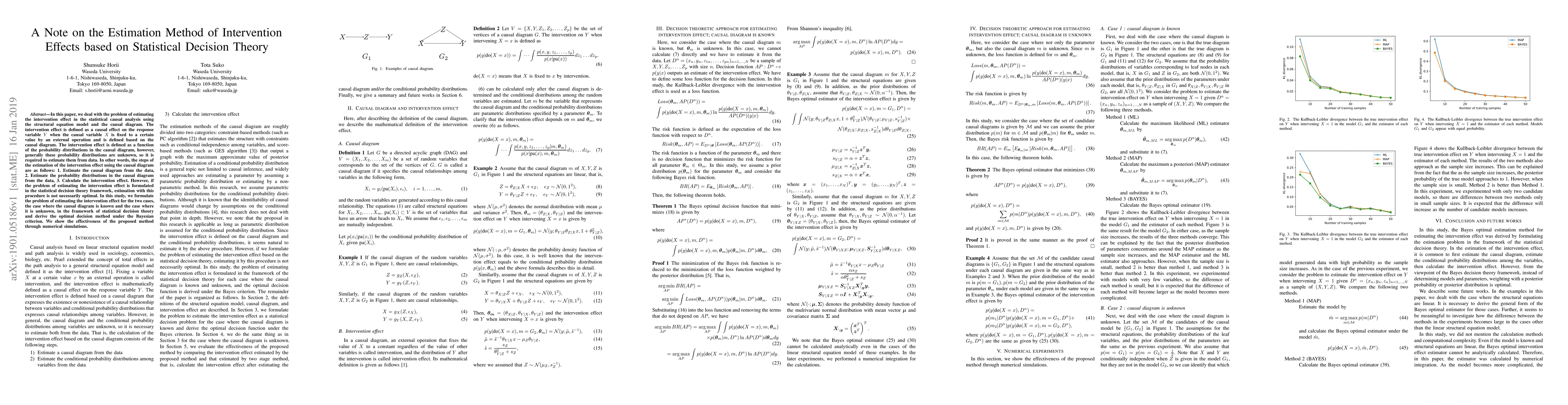 In this paper, we deal with the problem of estimating the intervention effect in the statistical causal analysis using the structural equation model and the causal diagram. The intervention effect is defined as a causal effect on the response variable $Y$ when the causal variable $X$ is fixed to a certain value by an external operation and is defined based on the causal diagram. The intervention effect is defined as a function of the probability distributions in the causal diagram, however, generally these probability distributions are unknown, so it is required to estimate them from data. In other words, the steps of the estimation of the intervention effect using the causal diagram are as follows: 1. Estimate the causal diagram from the data, 2. Estimate the probability distributions in the causal diagram from the data, 3. Calculate the intervention effect. However, if the problem of estimating the intervention effect is formulated in the statistical decision theory framework, estimation with this procedure is not necessarily optimal. In this study, we formulate the problem of estimating the intervention effect for the two cases, the case where the causal diagram is known and the case where it is unknown, in the framework of statistical decision theory and derive the optimal decision method under the Bayesian criterion. We show the effectiveness of the proposed method through numerical simulations.