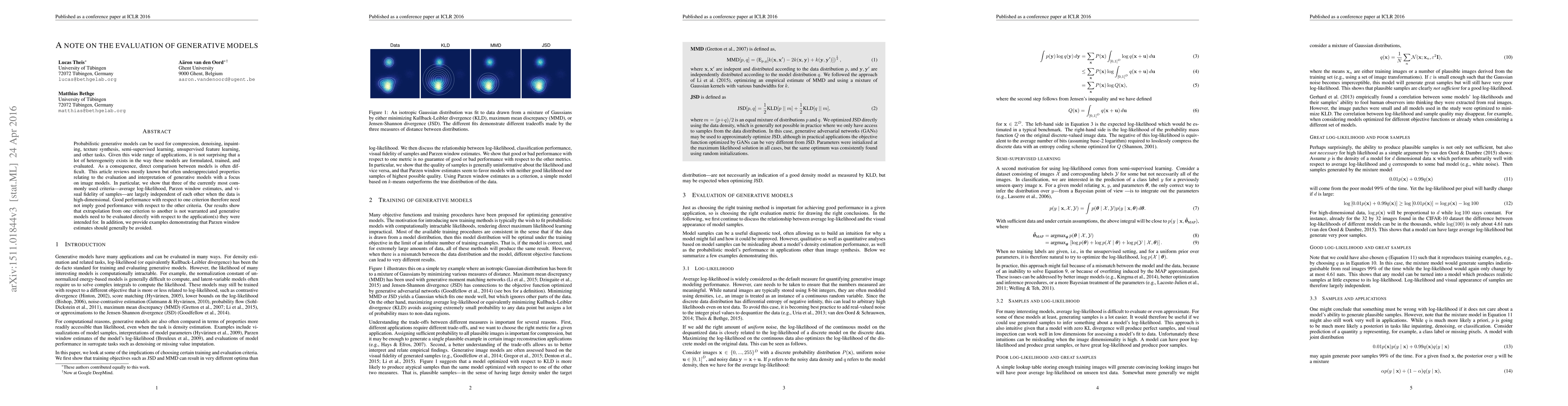 This paper reviews the evaluation of probabilistic generative models, highlighting that commonly used criteria like average log-likelihood, Parzen window estimates, and visual fidelity are largely independent in high-dimensional data. It argues that extrapolation between these criteria is not valid and emphasizes the need for direct evaluation tailored to specific applications.