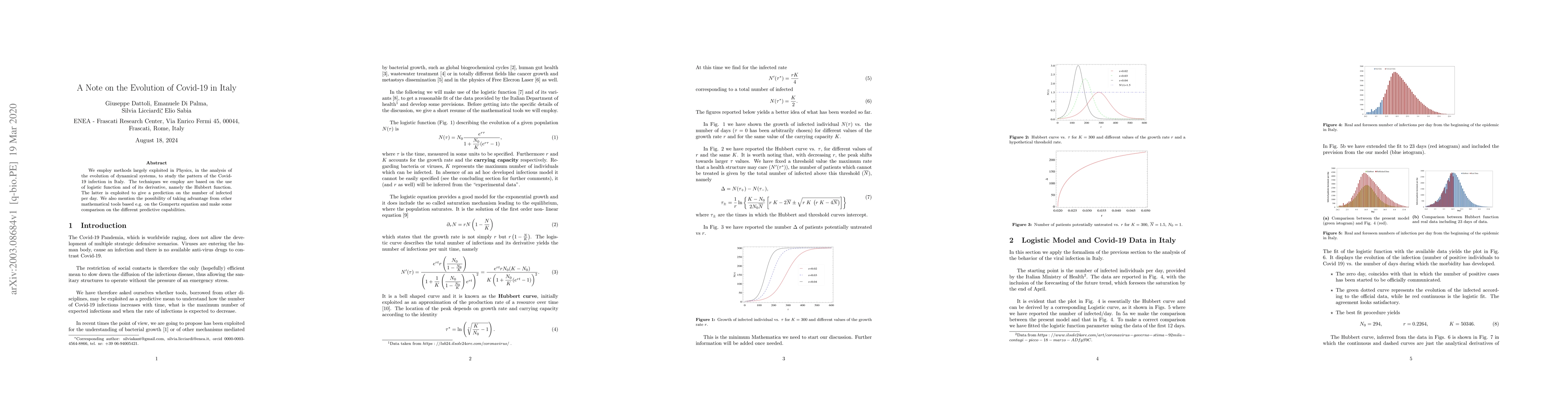We employ methods largely exploited in Physics, in the analysis of the evolution of dynamical systems, to study the pattern of the Covid-19 infection in Italy. The techniques we employ are based on the use of logistic function and of its derivative, namely the Hubbert function. The latter is exploited to give a prediction on the number of infected per day. We also mention the possibility of taking advantage from other mathematical tools based e.g. on the Gompertz equation and make some comparison on the different predictive capabilities.