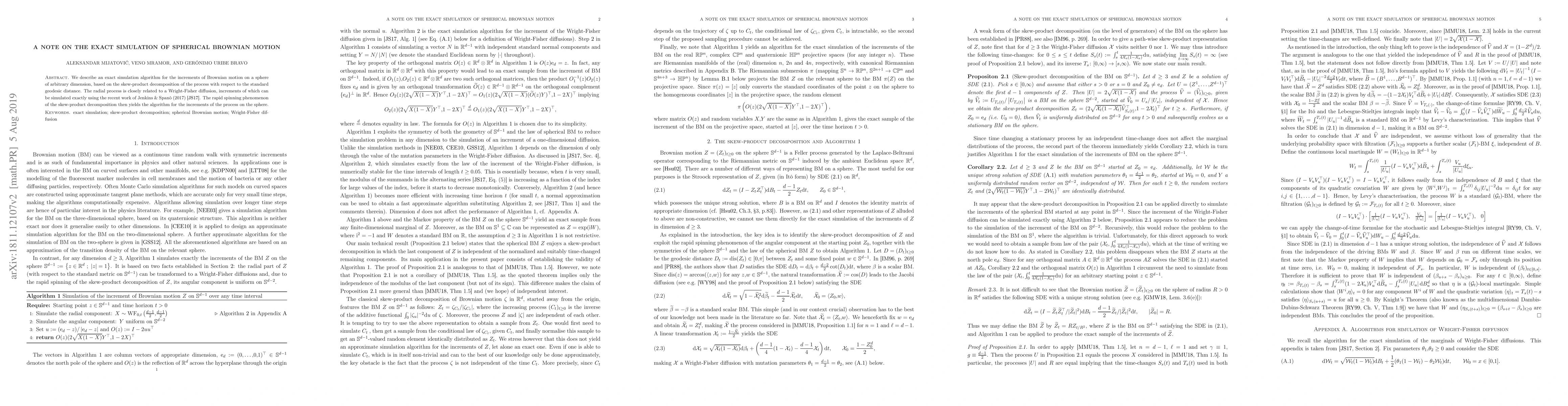 This paper presents an exact simulation algorithm for spherical Brownian motion increments using a skew-product decomposition based on geodesic distance. The radial process is linked to Wright-Fisher diffusion, allowing for exact simulation of its increments, leading to the proposed spherical Brownian motion algorithm.