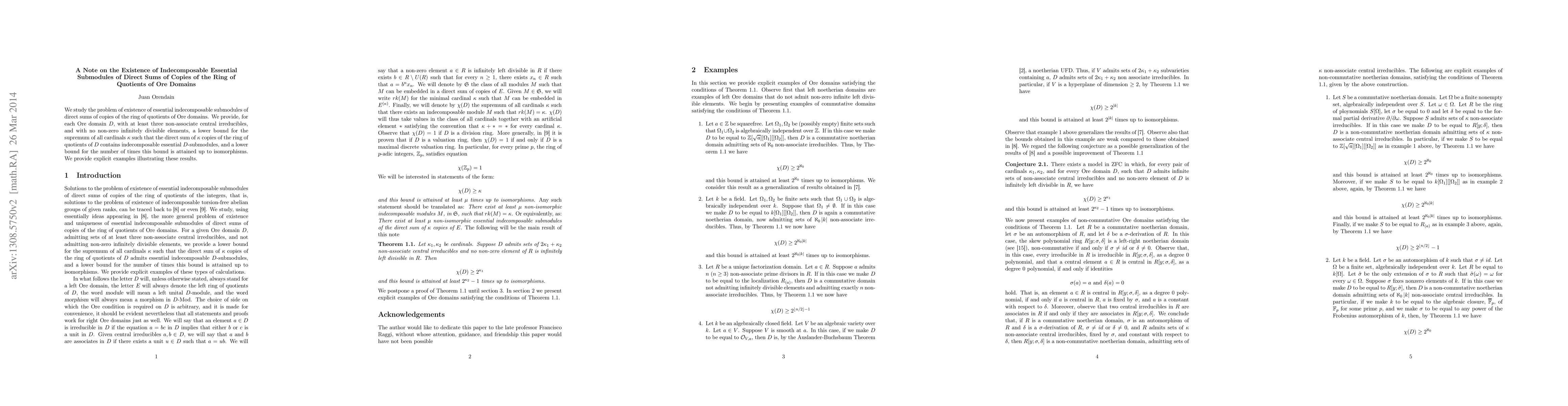 We study the problem of existence of essential indecomposable submodules of direct sums of copies of the ring of quotients of Ore domains. We provide, for each Ore domain $D$, with at least three non-associate irreducibles, a lower bound for the supremum of all cardinals $\kappa$ such that the direct sum of $\kappa$ copies of the ring of quotients of $D$ contains indecomposable essential $D$-submodules, and a lower bound for the number of times this bound is attained up to isomorphisms. We provide examples illustrating these results.