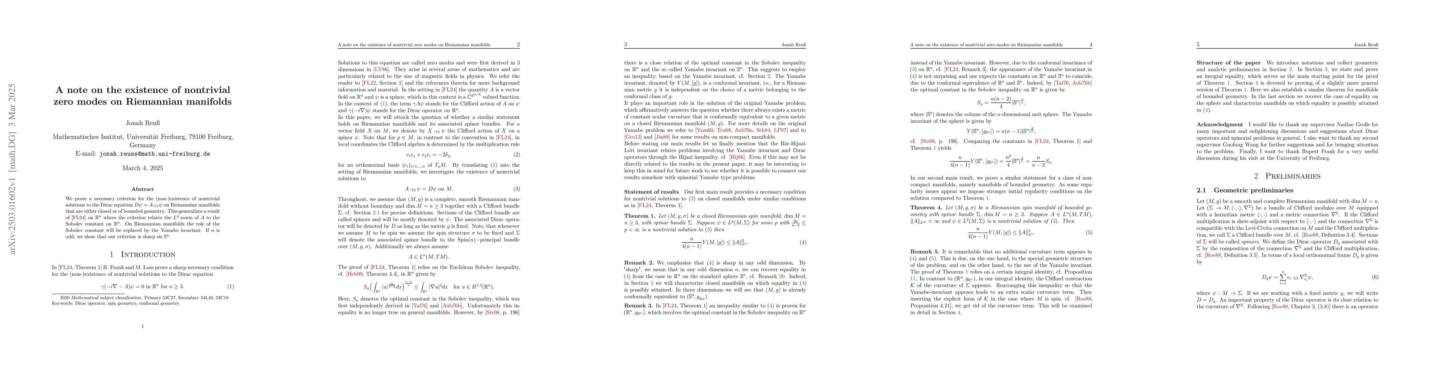 This paper establishes a criterion for the existence of nontrivial zero modes in the Dirac equation on Riemannian manifolds, generalizing a result from $\mathbb{R}^n$ by replacing the Sobolev constant with the Yamabe invariant. The criterion is shown to be sharp for odd-dimensional spheres.