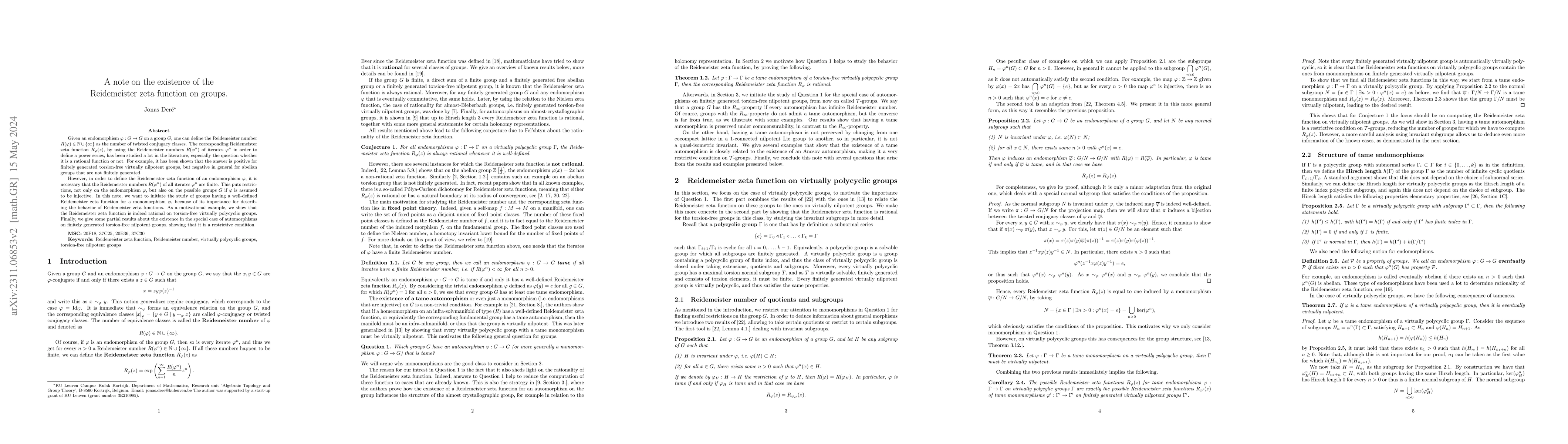 Given an endomorphism $\varphi: G \to G$ on a group $G$, one can define the Reidemeister number $R(\varphi) \in \mathbb{N} \cup \{\infty\}$ as the number of twisted conjugacy classes. The corresponding Reidemeister zeta function $R_\varphi(z)$, by using the Reidemeister numbers $R(\varphi^n)$ of iterates $\varphi^n$ in order to define a power series, has been studied a lot in the literature, especially the question whether it is a rational function or not. For example, it has been shown that the answer is positive for finitely generated torsion-free virtually nilpotent groups, but negative in general for abelian groups that are not finitely generated. However, in order to define the Reidemeister zeta function of an endomorphism $\varphi$, it is necessary that the Reidemeister numbers $R(\varphi^n)$ of all iterates $\varphi^n$ are finite. This puts restrictions, not only on the endomorphism $\varphi$, but also on the possible groups $G$ if $\varphi$ is assumed to be injective. In this note, we want to initiate the study of groups having a well-defined Reidemeister zeta function for a monomorphism $\varphi$, because of its importance for describing the behavior of Reidemeister zeta functions. As a motivational example, we show that the Reidemeister zeta function is indeed rational on torsion-free virtually polycyclic groups. Finally, we give some partial results about the existence in the special case of automorphisms on finitely generated torsion-free nilpotent groups, showing that it is a restrictive condition.