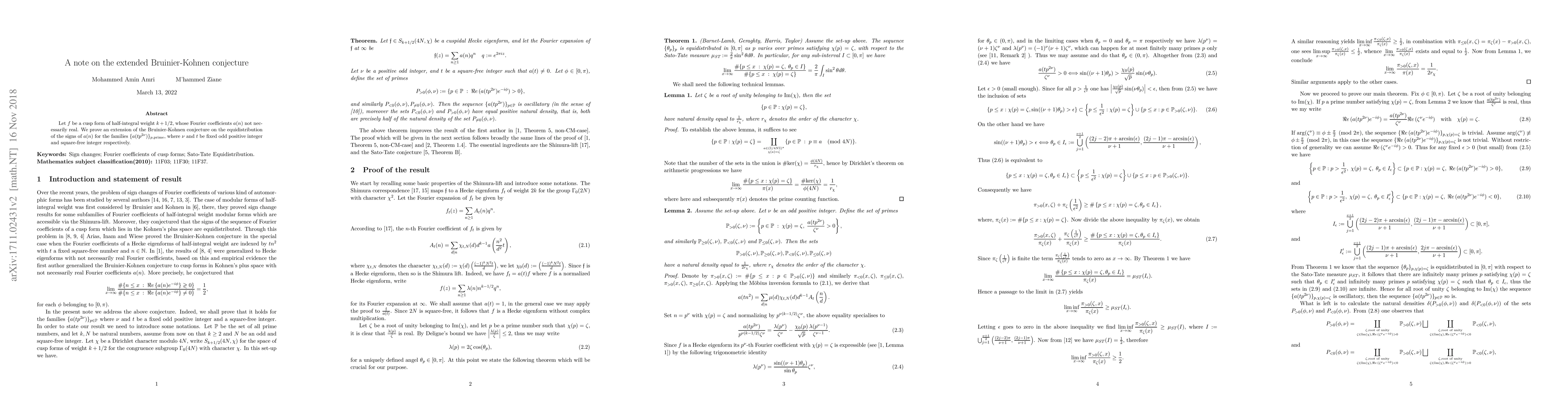 The paper extends a conjecture of Bruinier and Kohnen by verifying partially the equidistribution of signs of Fourier coefficients for cusp forms of integral half-weight, using Shimura lifts and the Sato-Tate conjecture.